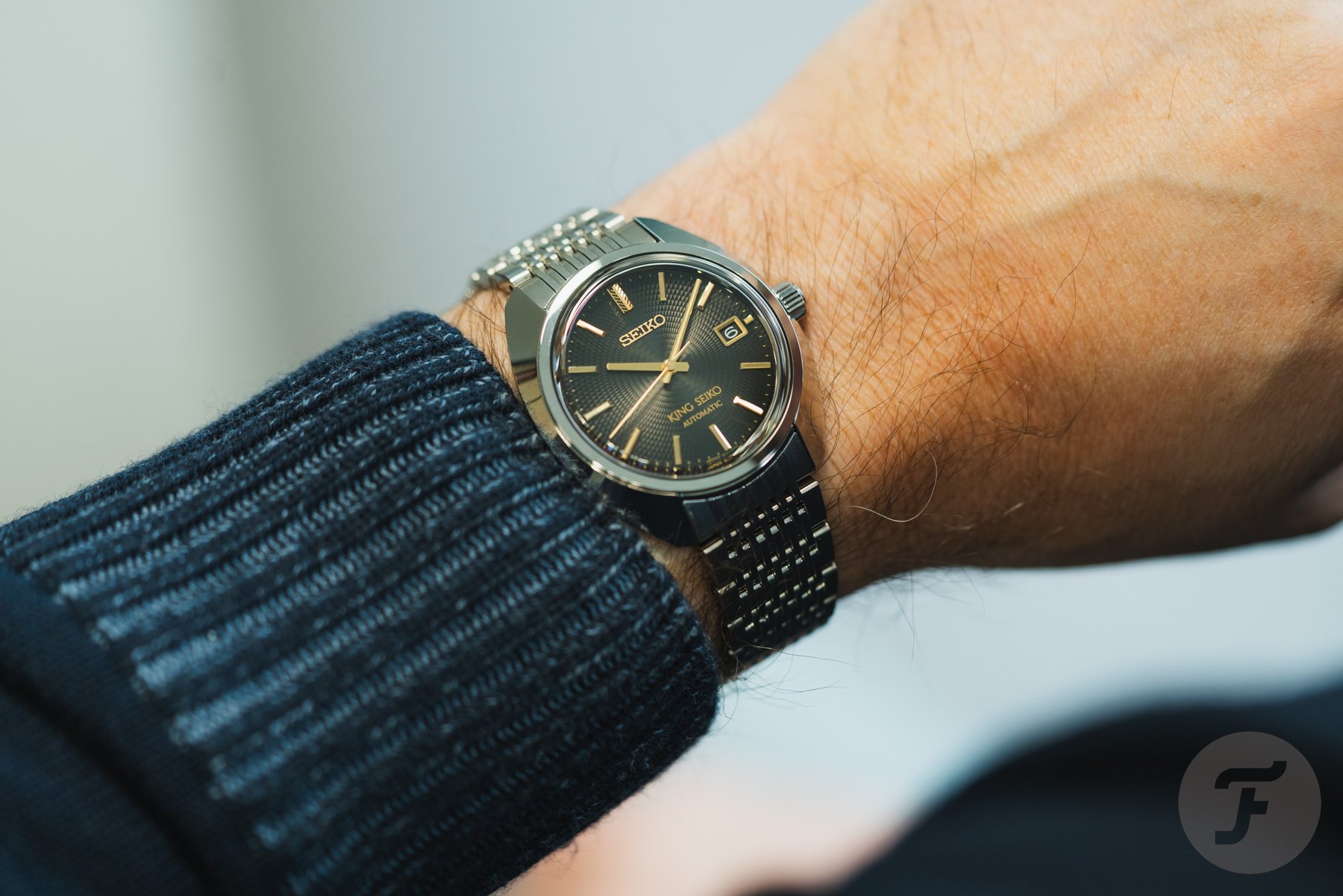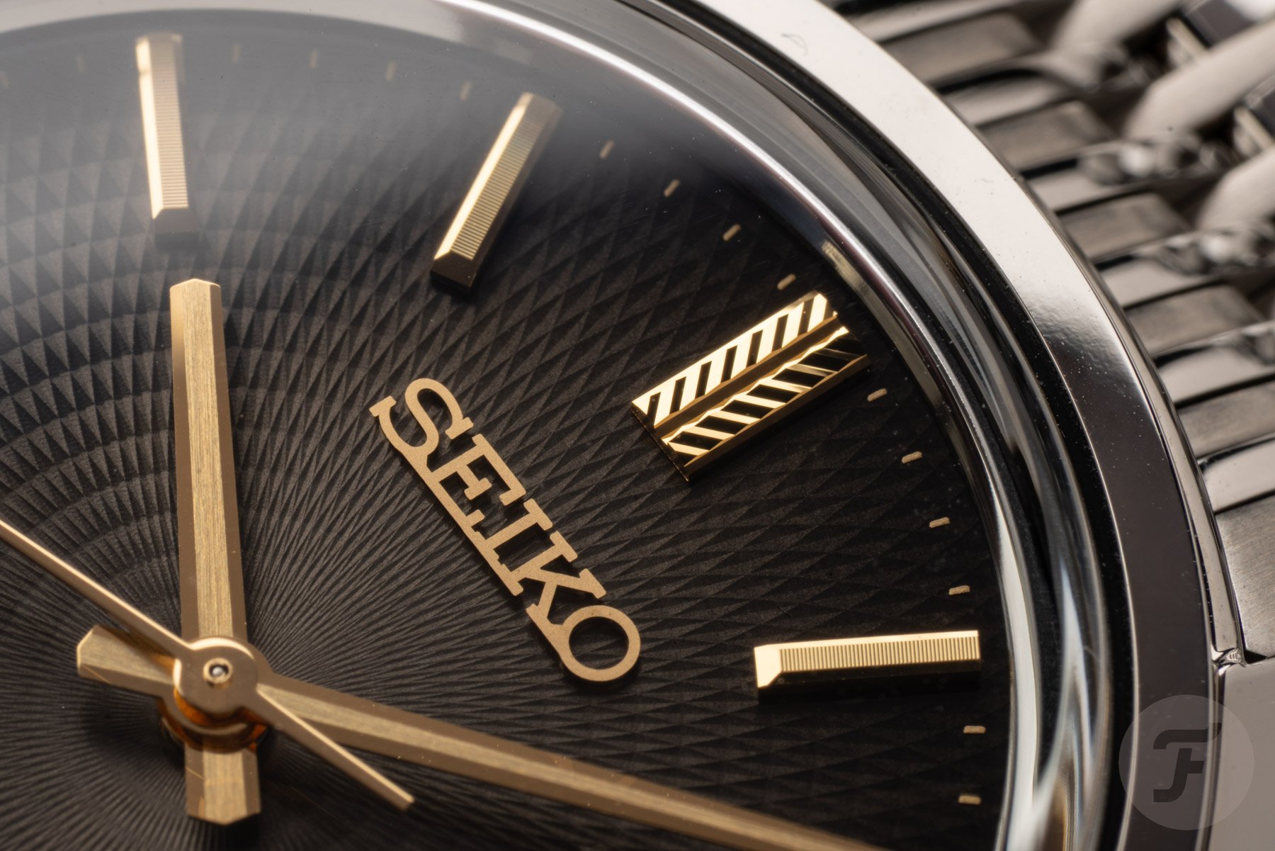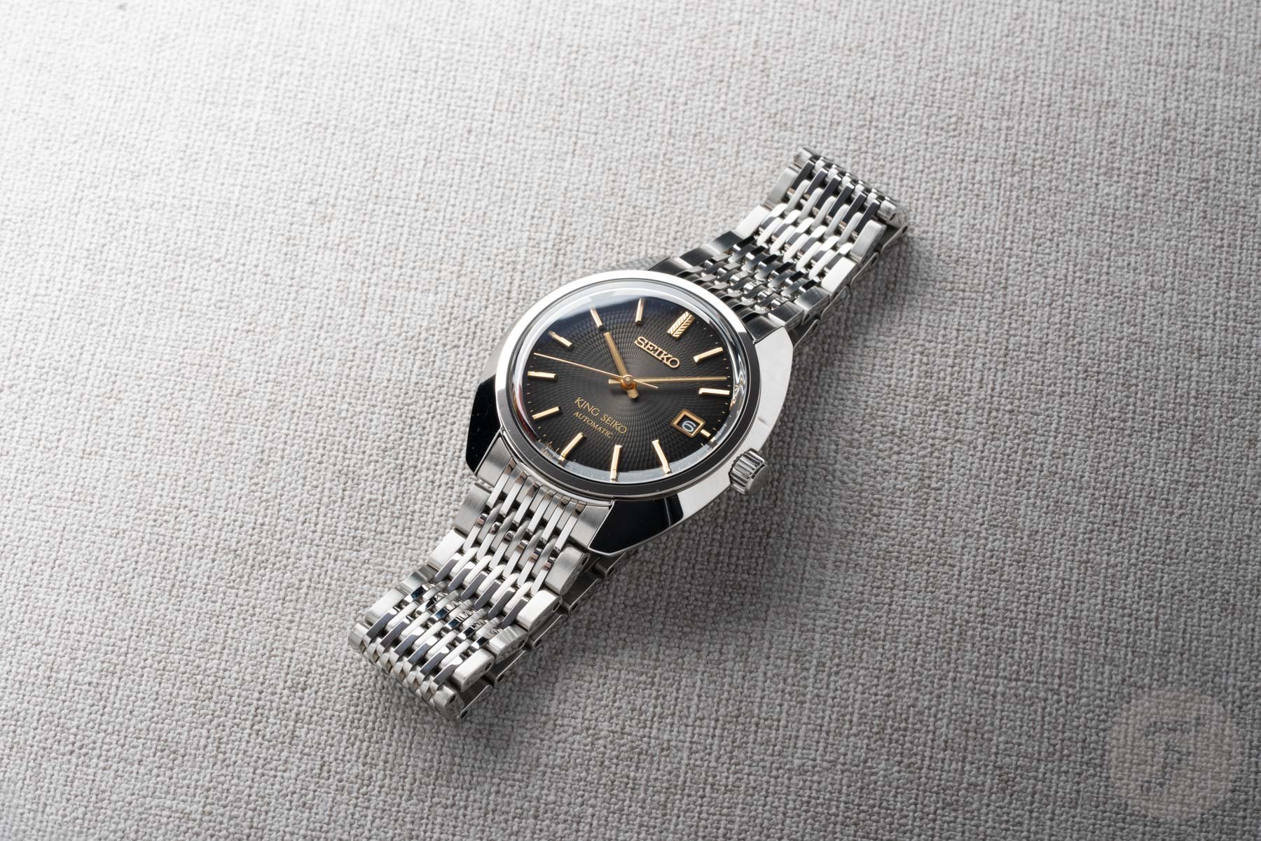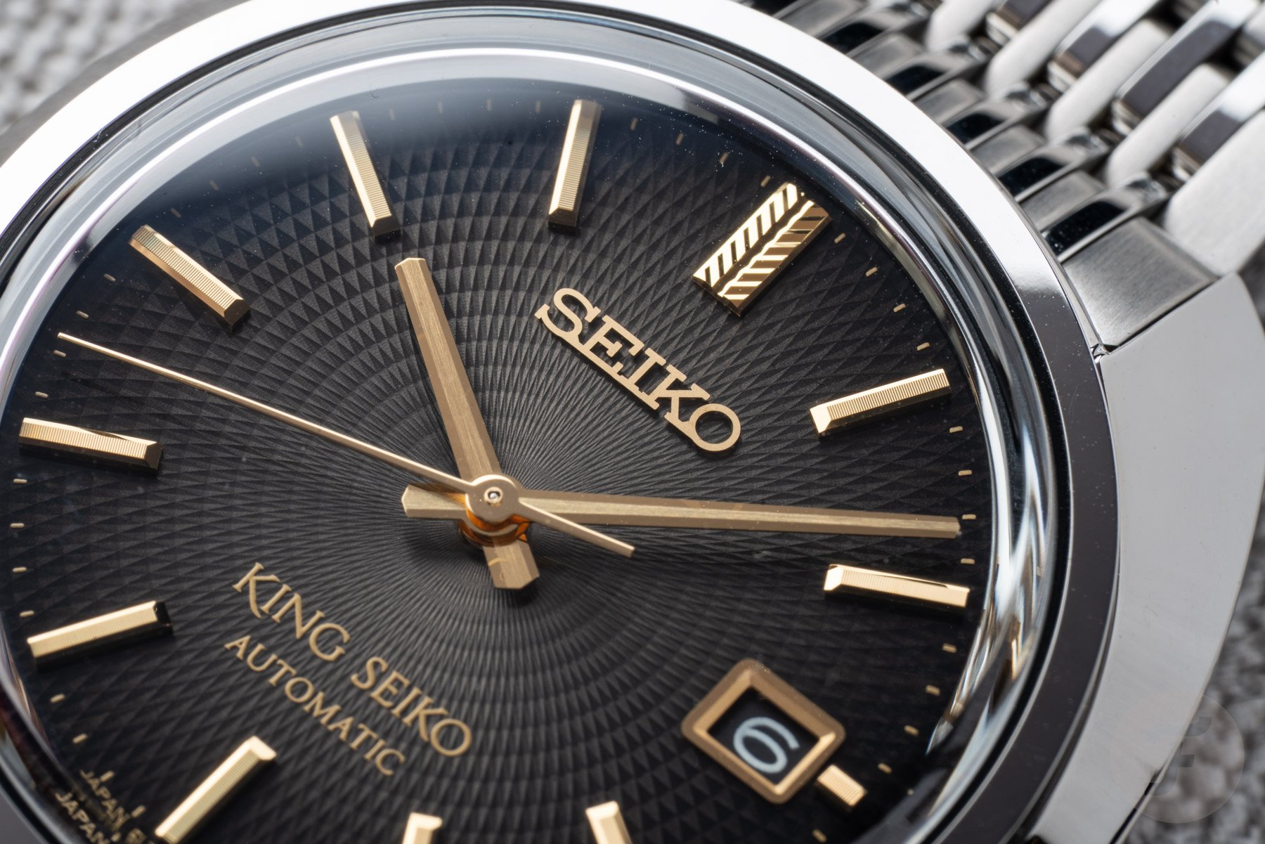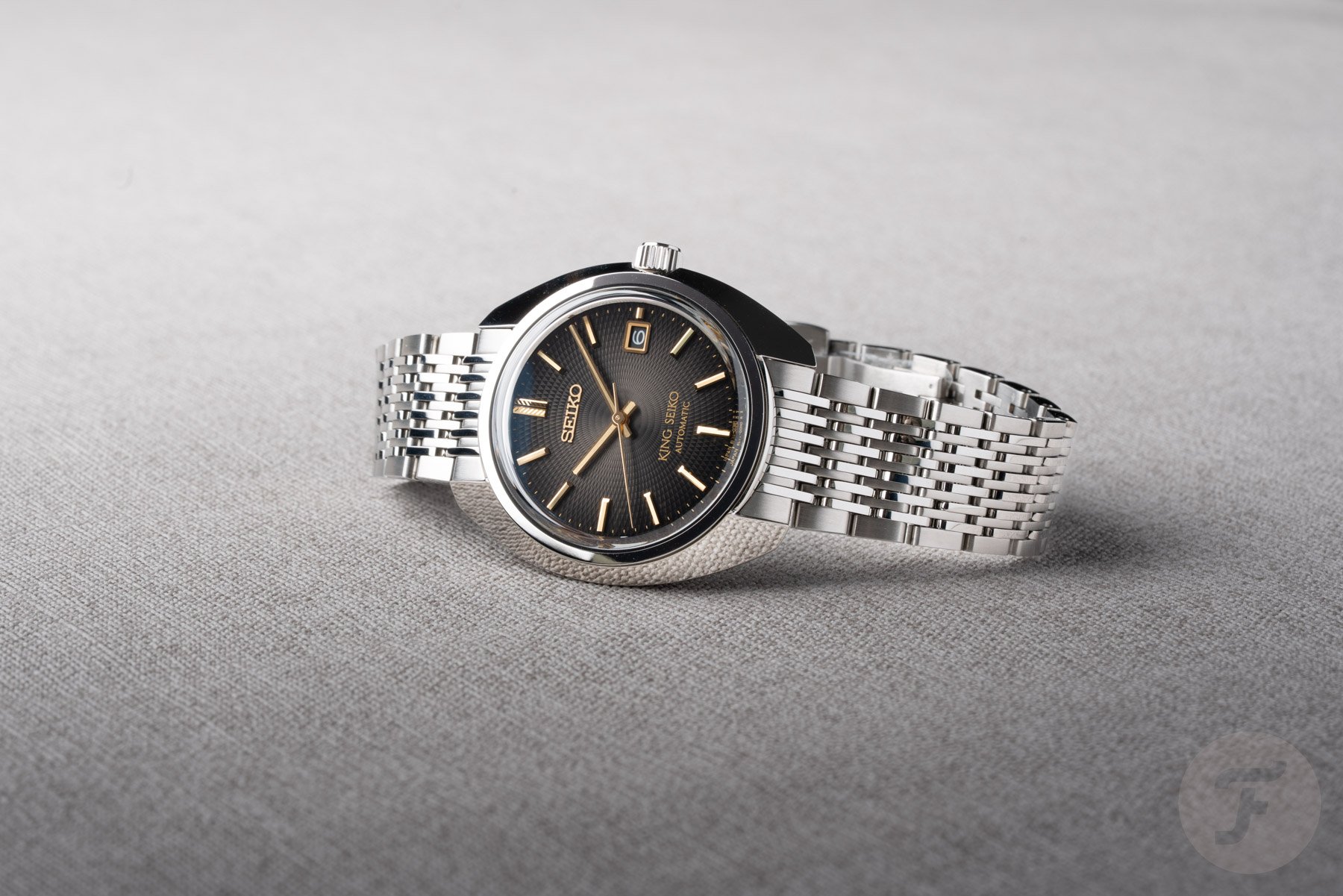 Additionally, I thoroughly enjoyed my hands-on experience with that specific watch, as the dial added a great deal of depth. The same goes for this new model. Underneath the box-shaped sapphire crystal, this King Seiko features a gray gradient dial with an intricate texture inspired by the pattern that Kintaro Hattori arranged to be engraved on his timepieces.