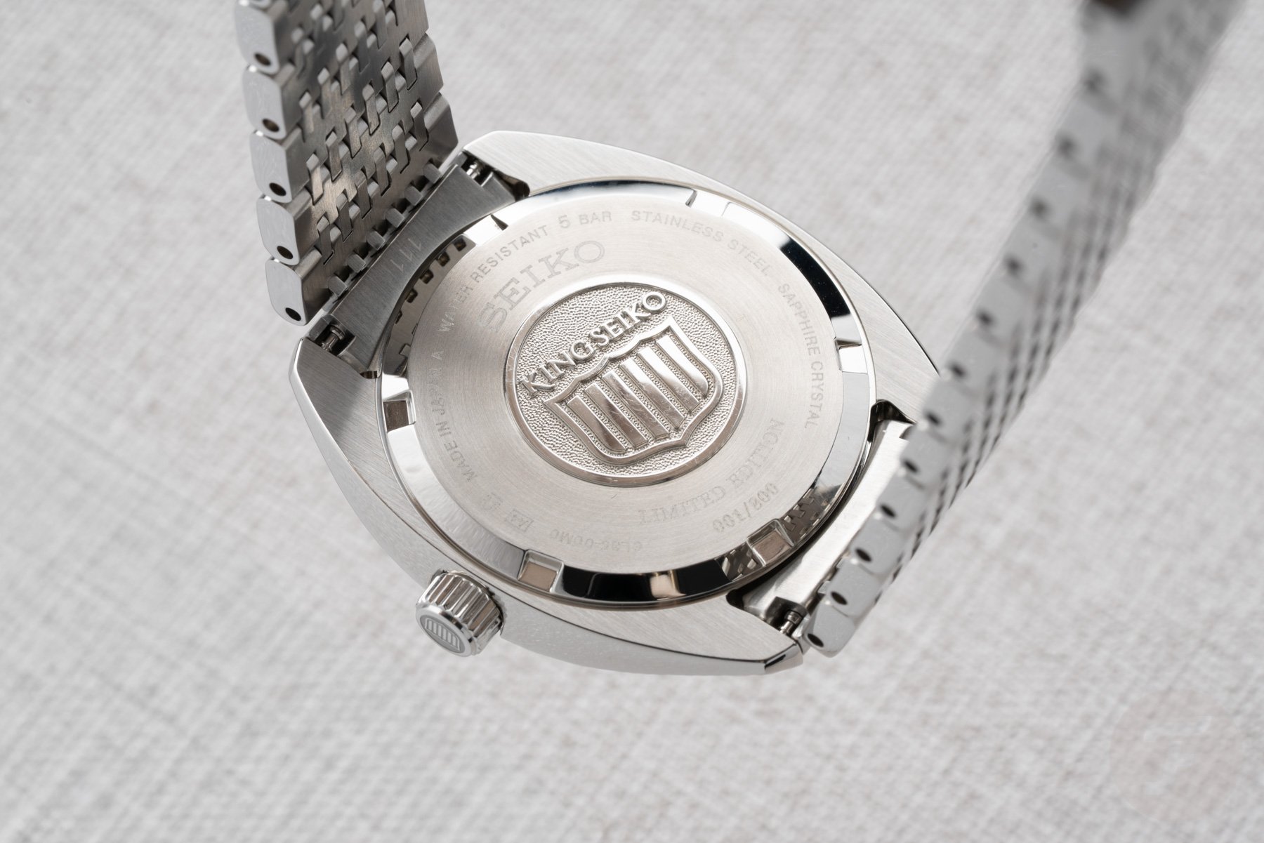 This automatic movement operates at 28,800 vibrations per hour, has 26 jewels, and offers a 45-hour power reserve. Seiko rates the 6L35’s accuracy to +15/-10 seconds per day. The caliber lies hidden behind the familiar King Seiko case back. Completing the now-familiar look of the SJE line is a multi-row bracelet, which features an intricate mix of brushed and polished parts for added visual impact.