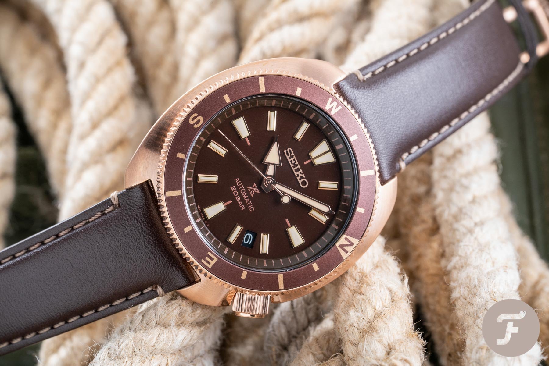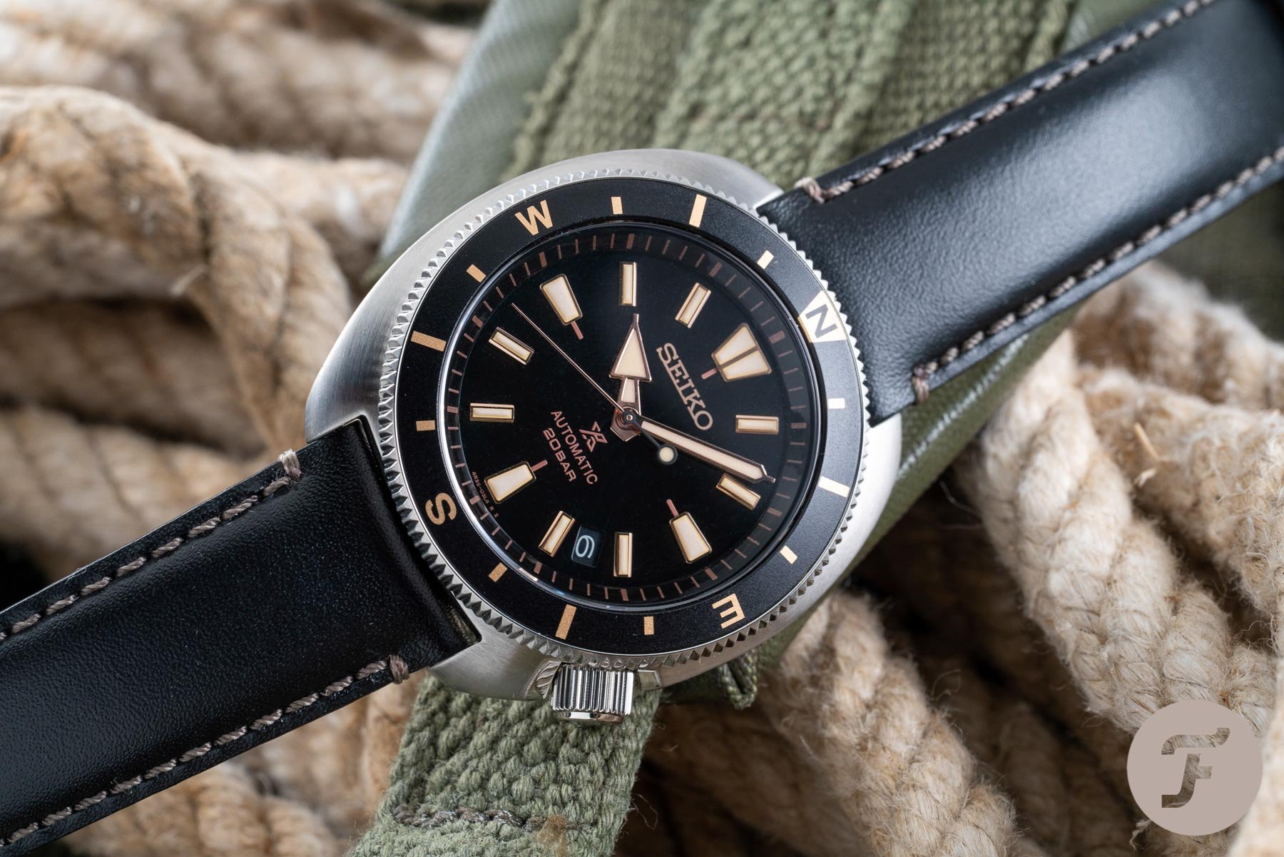 Maybe it’s smart to talk prices right away since the article about the limited deep blue SLA049J1 and unlimited dark gray SLA051J1 stirred some discussion about the pricing of these watches — the Prospex Naomi Uemura 80th Anniversary Limited Edition SLA049J1 costs €3,200, and the non-limited SLA051 has a price of €3,000. These prices were considered steep. The brown and gold version you see here, however, has a much more approachable price tag of just €590. The other three are set even lower at €540. Now we have that out of the way, let’s see what you get for your money.