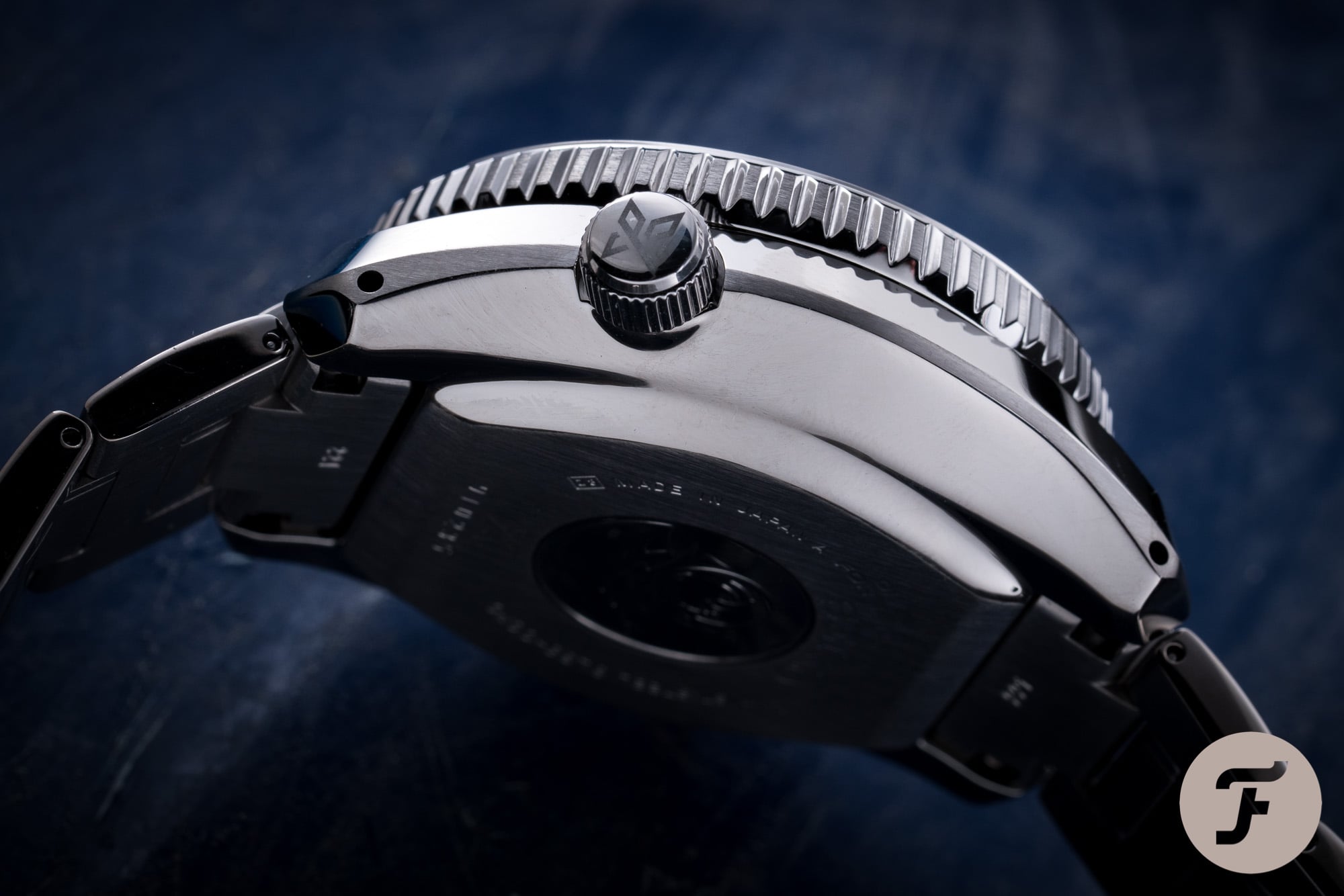 In fact, there is no case back. The case consists of two parts, the case and the bezel, so everything has to come in (and go out) via the crystal. The Seiko Marinemaster 300 SLA021J 1 uses the same monobloc construction as the previous references, which is ensuring water resistance and makes a helium valve (if you’d need one anyway) redundant. On the case back, there’s the ‘Big Wave’, or ‘tsunami’ logo in bas relief as well as some engraving with regards to the reference number, serial number, water resistance etc. If you aren’t already aware of this, the serial number also indicates the year and month in which this watch was produced. As you can see, the serial number on ‘our’ watch starts with 91, meaning that it was produced in 2019 and in the first month, to be exact (9 – 2019, 1 – January). The other numbers are just the ‘production’ number of the piece. Of course, as a professional diver’s watch, the Marinemaster 300 SLA021J1 also has a screw-down crown, as pictured below.