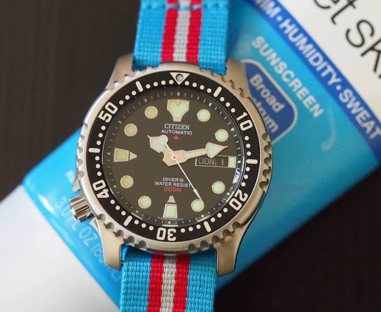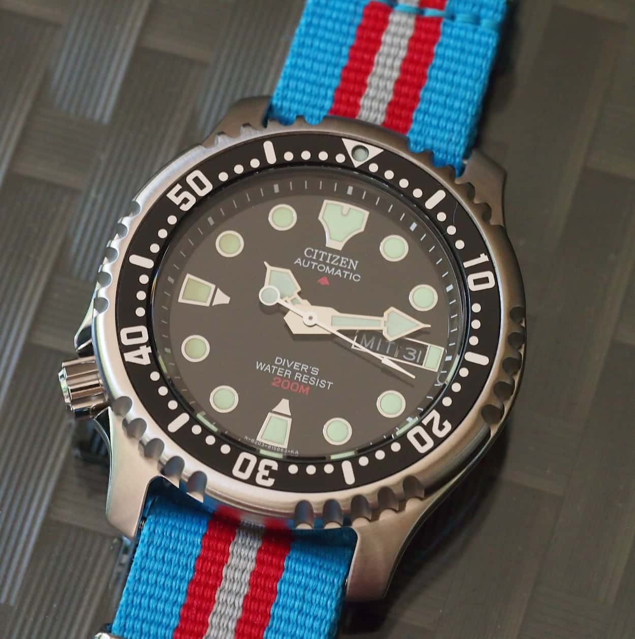 Here again, I’ve paired the Citizen with a NATO strap. This one is admittedly brighter than what I paired with the SKX007 but I think that augments the glossy dial and greener lume plots. I’ve seen Citizens on bracelets and it looks great but I cannot speak to their quality. This watch came with a slightly more flexible rubber strap that is still too long for me. Also, I know it’s Citizen tradition, but I don’t love the decompression tables printed on the side of the strap. One nice thing about the NY0040 is that they are available in several dial colors along with black such as cream, blue and yellow.