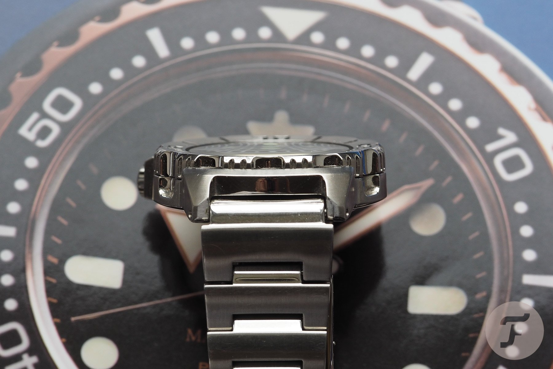 Changing looks on the Seiko Monster SKX779 is made all the more simple with drilled lugs. This Seiko was sold on either a rubber strap or a stainless bracelet with plate-like links. It’s not a bad bracelet, but it’s thick and the links are somewhat longer than one might expect. The clasp is is push button with a flip lock and links are affixed via pin and tube.