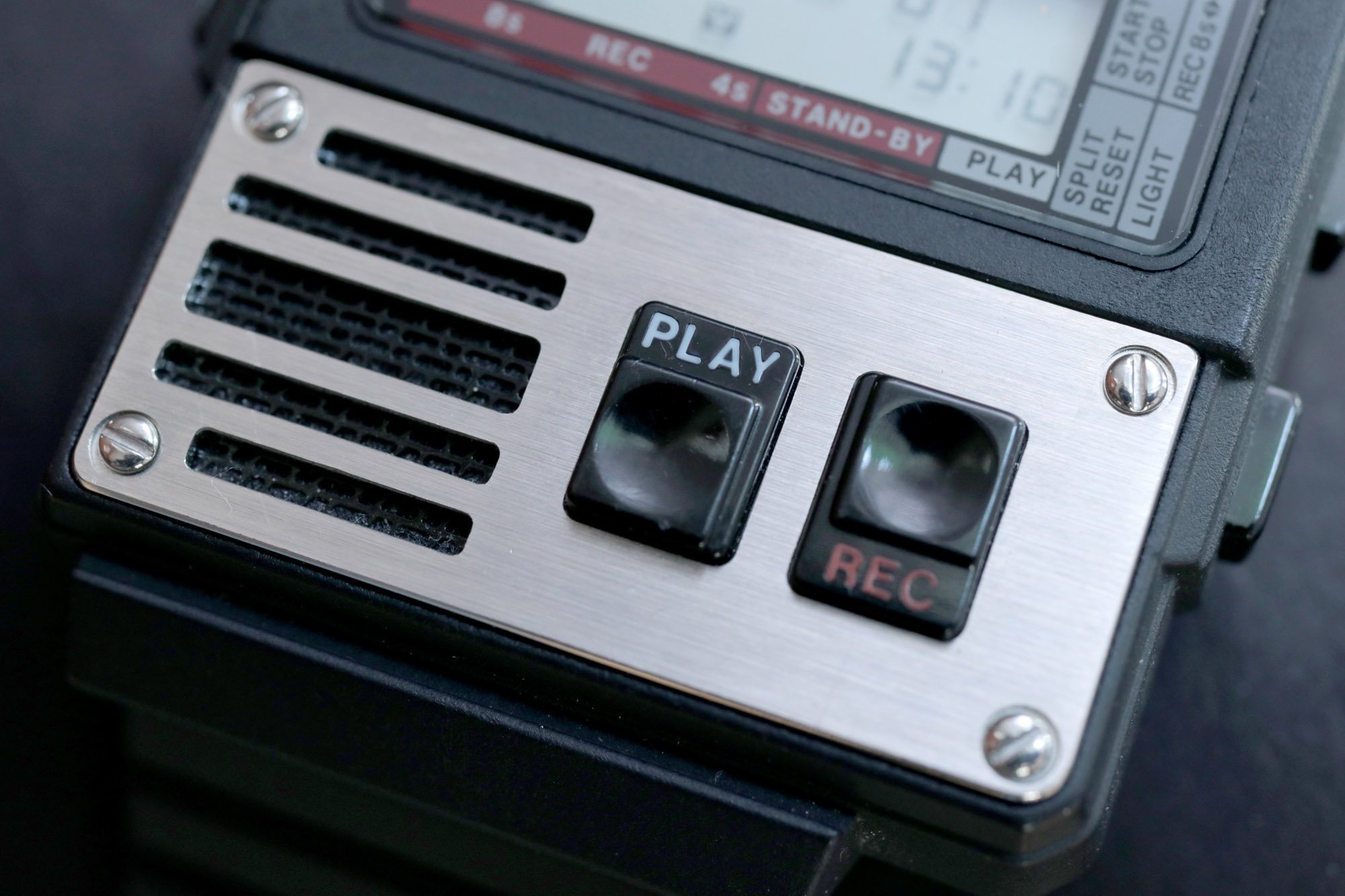 If you are still with me, I am sure you’ll uncover the charm of this watch. To start counting off some of its considerable features, take the commercial nickname Voice Note. A no-brainer, it suggests a voice recording feature. Nothing revolutionary if looking at my iPhone sitting next to my keyboard. But when you realize you could find this feature built in a watch that was listed in 1983 catalogues, it’s quite remarkable. I think it is the first commercial watch ever to feature this kind of functionality.