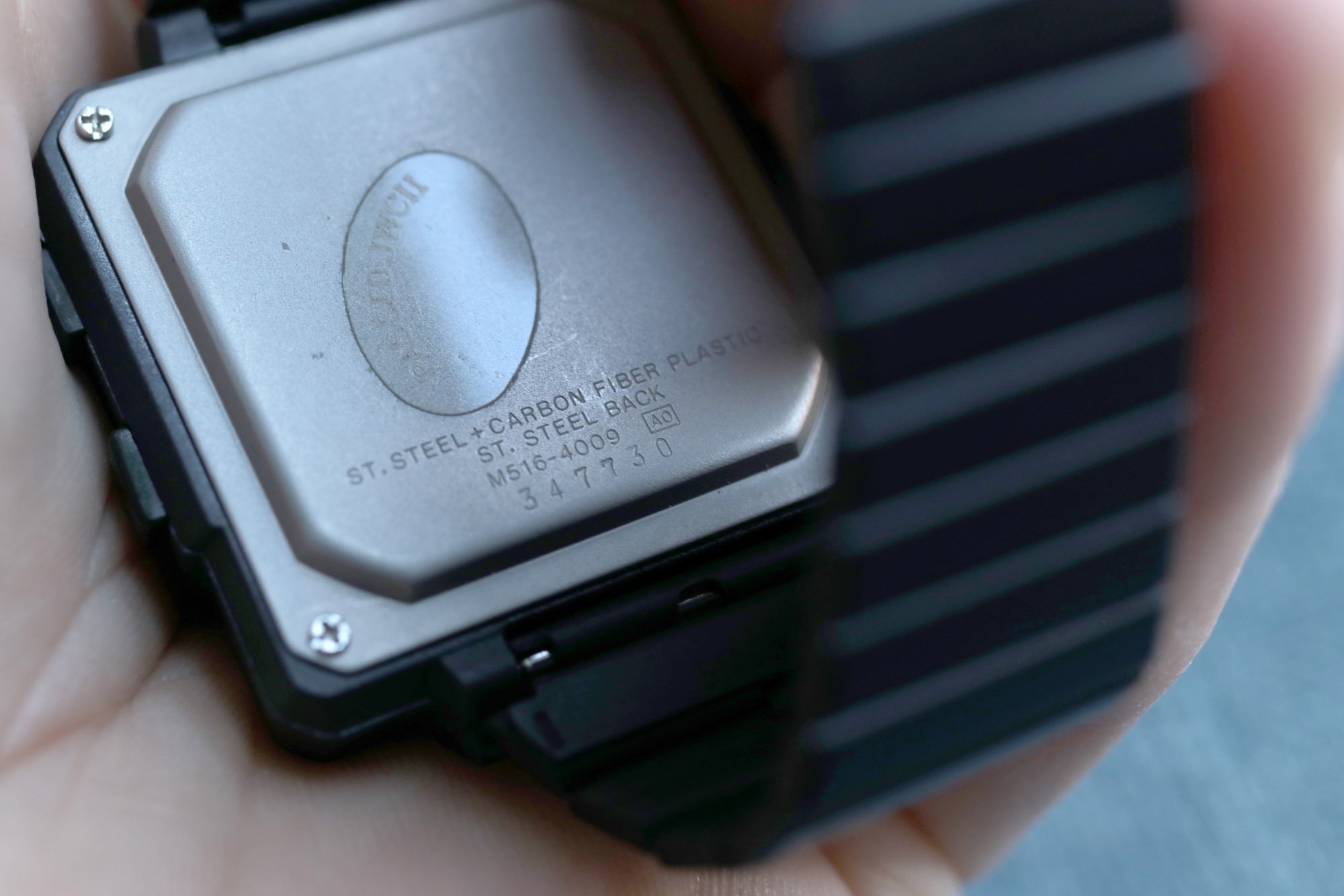 When I first spotted the Seiko M516-4009, I thought I was looking at some black plastic generic watch body. I should thank the thin and brushed metal plate covering the mic and speaker for making me stop to dig deeper. I browsed for more pictures and only then found out that the watch case and bracelet are constructed from a combination of stainless steel and carbon fibre plastic. That would answer my thought regarding today’s limited availability. This Seiko and its materials were quite the pioneers back in the 1980s and you know – today Tesla isn’t the cheapest toy either.