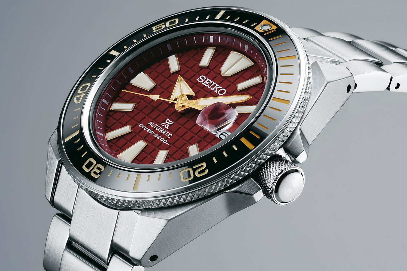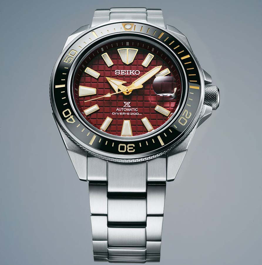Other than that, this latest iteration features the “King Samurai” case, nicknamed such due to its more angular lugs. The bezel’s knurled edge shares the diamond grip pattern found on the hilt of a Japanese katana. Honestly, the colorway Seiko has opted for here really suits the watch. Not just in terms of aesthetics, but also in the name. There’s something about the mix of deep, dark red, gold, and glossy black that screams “Samurai.” Throw this one on a dark green leather strap with gold stitching, and you’ve got yourself a combination as sharp as the Samurai’s own blade. Inside, the automatic Seiko 4R35 beats away at 21,600vph with around 40 hours of power reserve.