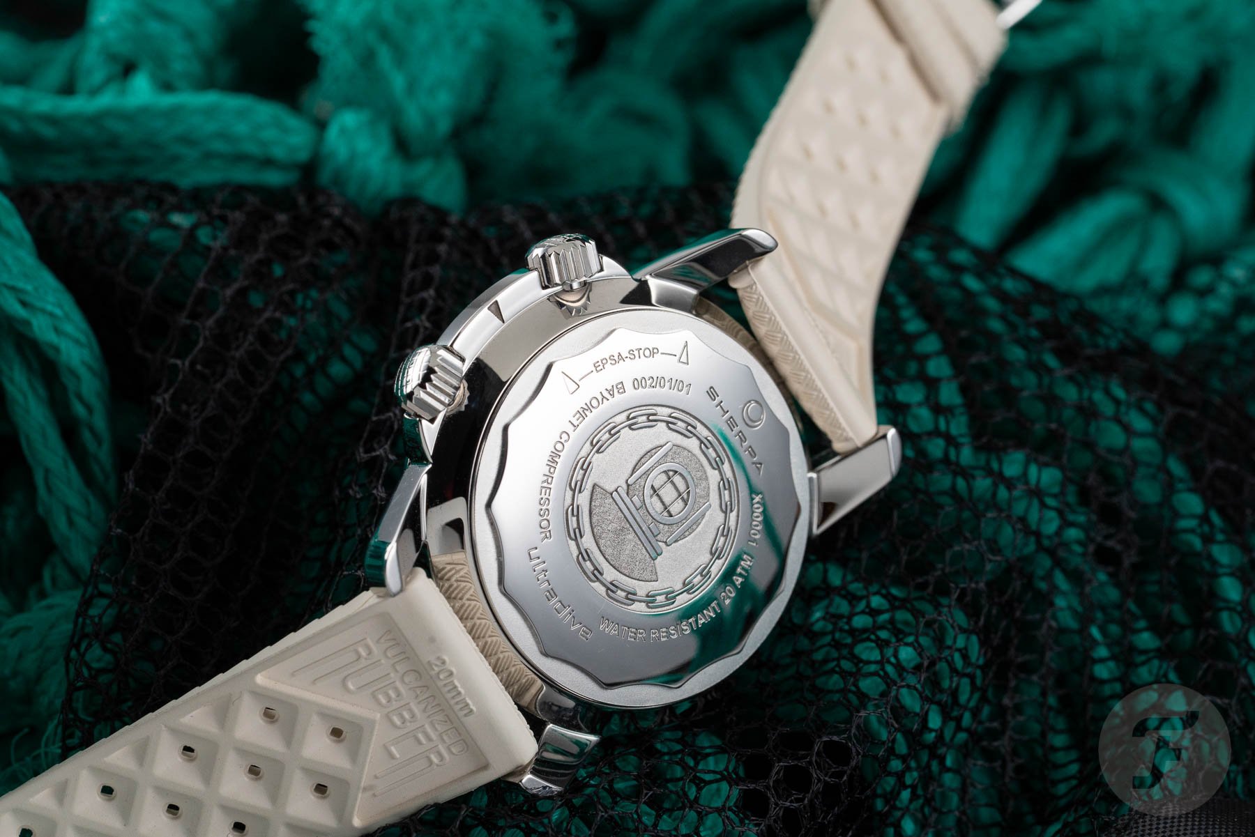 True to the original, neither crown is screw-down, but the watches are water-resistant down to 200 meters (testing shows even more). The case back uses a bayonet-style closure. Fittingly, the case back is adorned with an EPSA-like dive helmet. Underneath the case back, we find the Sellita SW200-1 automatic. Martin chose the top version, but I suppose that’s not going to excite most enthusiasts. What is interesting is that Martin worked with a supplier in Solingen, Germany (the home of German knifemaking) to laser inscribe two wheels within the movement. As a practicing Buddhist (perhaps, this is why the Sherpa name resonated with him), he asked that the wheels be inscribed with a Tibetan Buddhist mantra in Tibetan font. If you’re not convinced, consider that a special laser needed to be created to reach such small sizes.