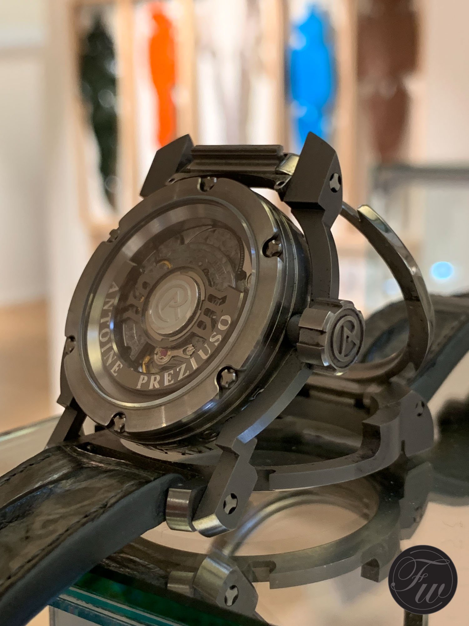 While we rushed around between appointments, one that literally caught my eye and stopped our track was an unusual-looking timepiece by GPHG double-award winner Antoine Preziuso. It was perhaps a style that (pleasantly) surprised me from what I knew of the brand’s elaborate artistry. Famous for their patented horological inventions and highly adorned masterpieces, the Genevan family-run watchmaker introduced us to a rugged entry-level time only model, B-Side Automatic.