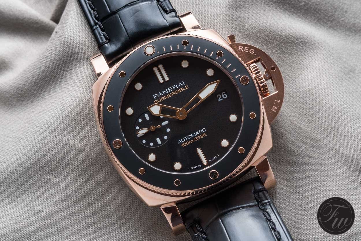 Besides some other brands, Panerai was flooding the social media channels a lot today. At least that is my impression so far. Panerai only focuses on the Submersible collection this year and do this with special versions and collabs with people like Mike Horn, or the Italian Navy or with the Luna Rossa America’s Cup team for example. Interestingly enough, Panerai offers some of these watches in just very limited quantities and the purchase includes a day with the Italian Navy or a trip with Mike Horn. The watch is being sold together with ‘an experience’, perhaps a once-in-a-lifetime one to be honest. But these ‘combination packages’ definitely have their price (think approx. 40.000,= Euro). Aside from these special editions, they also showed some very interesting regular Submersible collection watches. One of my absolute favourites was the 42mm in gold, with black ceramic bezel. It isn’t exactly a new model, but Panerai now added the ceramic bezel and an upgraded movement. The gold just looks very good on this Panerai Submersible in 42mm, and the size makes it a very versatile watch. The 47mm pieces look rugged, and I can easily have that on my wrist, but from experience, I know that at the end of the day, I take the watch off because it’s not comfortable anymore.
