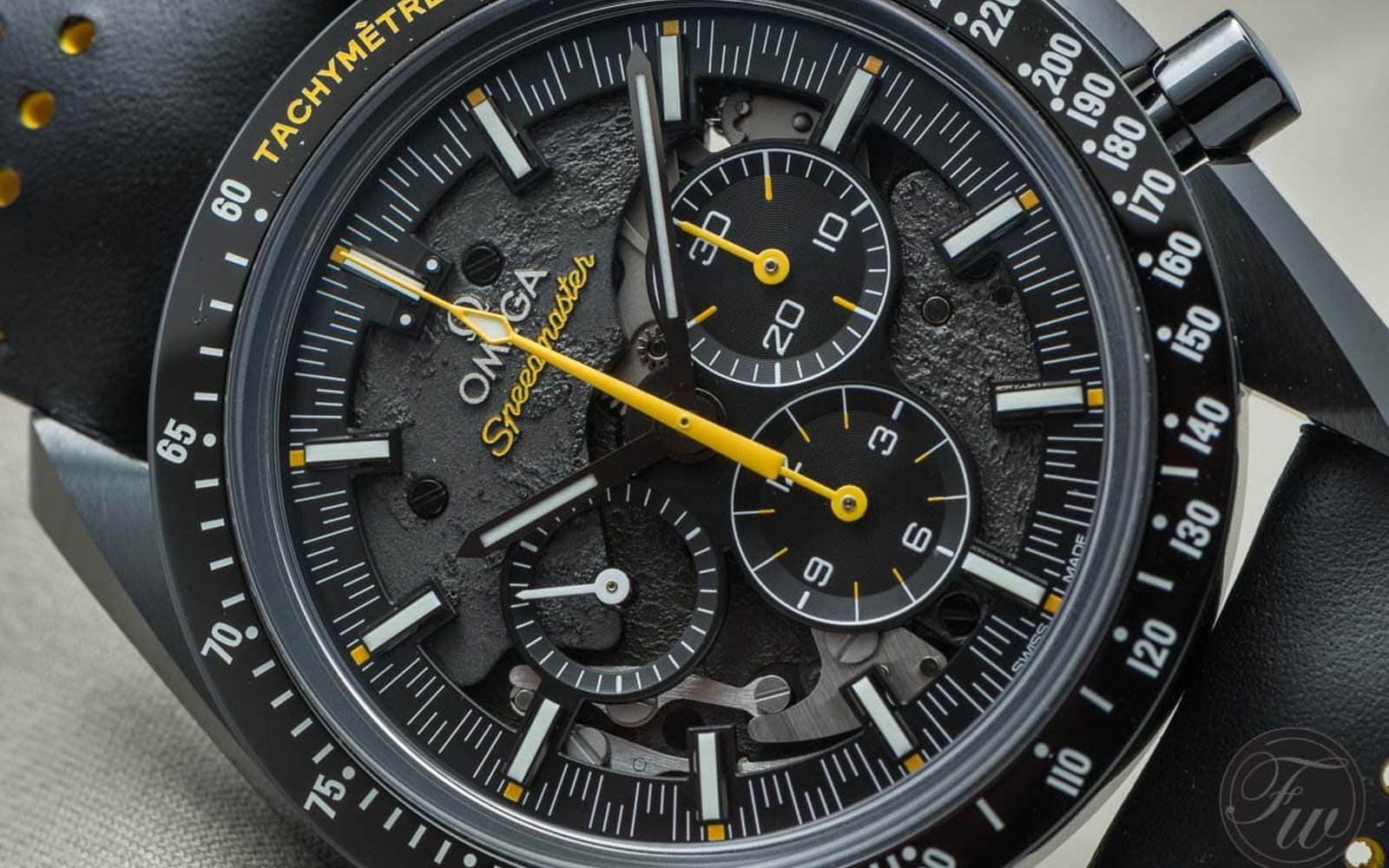 Would all white would make it too boring? Blue wouldn’t make sense either, or red (would make it too much Dark Side of the Moon). One thing is for sure, you can’t please everyone. The vintage Speedmaster guys are probably in the camp where they don’t care much about this watch, but people who have a focus towards new watches and perhaps already own a Speedmaster (Dark Side), might find this piece particularly interesting. It has a lot of ‘Moonwatch’ influences, but still add some new technology to the table like a ceramic case and bezel. The tachymeter scale is luminous and so is the Omega logo on the crown. The racing element to this watch, the use of yellow and the perforated strap is grabbing back to the roots of the Speedmaster line-up.