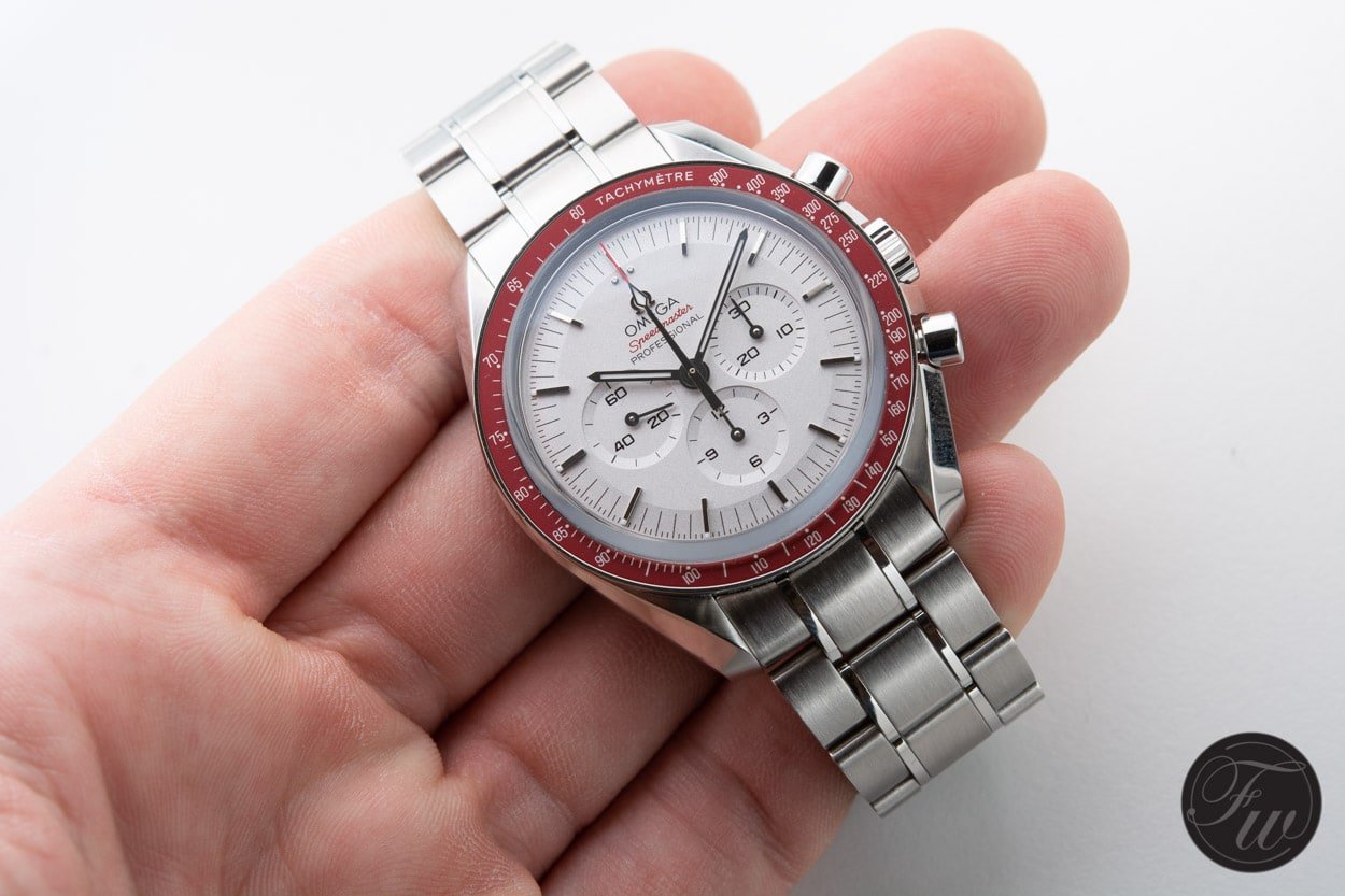 The Speedmaster Tokyo 2020 Limited Edition that represents the black ring is perhaps the most favoured one by the Speedmaster crowd, or at least those who are participating in the fabulous #SpeedyTuesday group on Facebook. It is clear where its inspiration came from, as the Panda dial is very sought-after. Originally, in 2003, Omega released a Speedmaster Professional for the Japan department store Mitsukoshi. I remember that the late Chuck Maddox managed to buy one back in those days, which was quite special. Only 300 pieces made, and I assume that most of them stayed in Japan (which has a large Speedmaster community). You will find franken versions of the Mitsukoshi, where the dial and hands were ordered as spare parts and swapped with the standard black dial and white baton hands. But that doesn’t make it a Mitsukoshi of course.