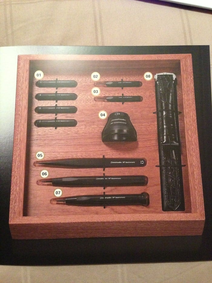 Inside, there is a black leather lining and pillow for the Speedy watch. However, if you lift it (using the metal bars on the sides) you’ll see that there is another compartment in this wooden box. It holds special watchmaking tools, an extra leather strap (alligator) and a folding clasp. The tools consist of a pair of pliers, screw drivers, a loupe (in the shape of an Apollo shuttle) and a few tools to remove spring bars. All tools are perfectly documented in a special manual, shown below: