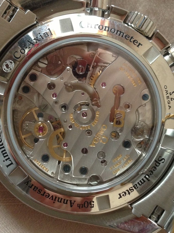 Unlike the Speedmaster Professional 50th Anniversary, this Speedmaster 1957 has no Lemania hand-wound movement. The Co-Axial column wheel chronograph movement caliber 3201 in this Speedmaster 1957 is actually based on a Piguet 1285 movement. It is not only a Co-Axial column wheel chronograph, but also chronometer certified (COSC) as can be seen below.