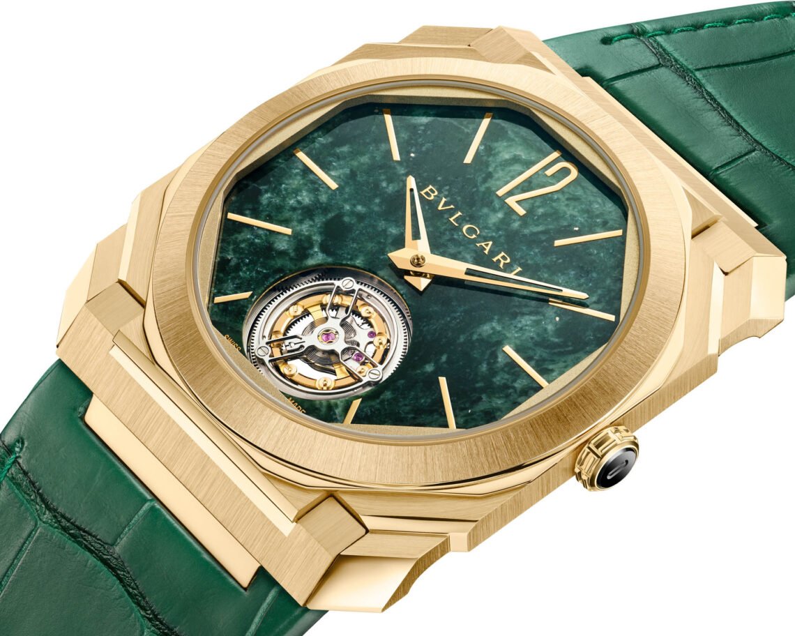 Last but not least comes the Bvlgari Octo Finissimo Marble Tourbillon (€140,500 ex. taxes). I wore this watch for a few mesmerizing minutes during this year’s Watches and Wonders, and it blew me away. The green dial’s marble stone comes from quarries in the northwestern region of the Aosta Valley in Italy. Its “Verde Alpi” color is both Alpine and very Roman. Framing the dial is a yellow gold case paired with a green leather strap. Wearing this watch is like strapping the famous Bvlgari boutique at Via Condotti 10 in Rome to the wrist.