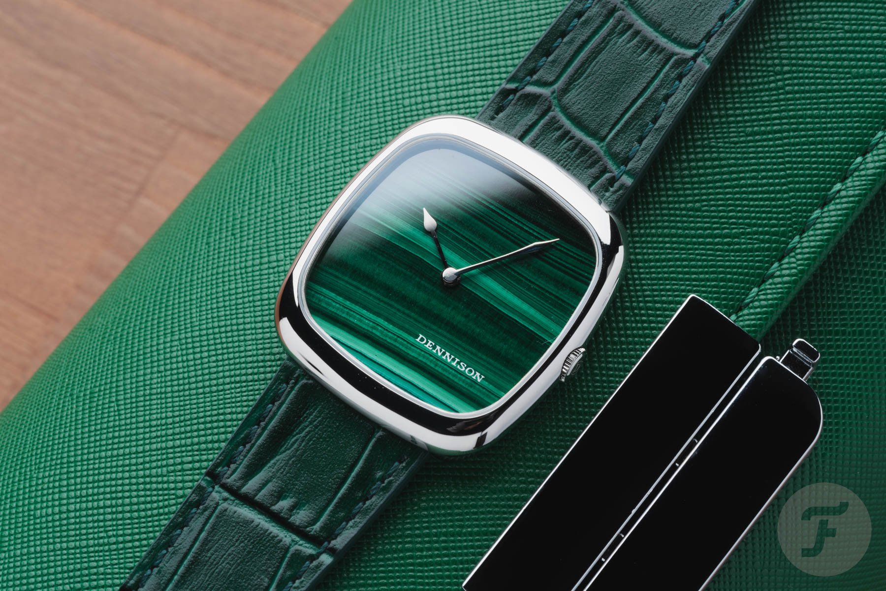Dennison offers seven stones — malachite, tiger eye, aventurine, lapis lazuli, aventurine, rubellite, and agate — and a choice of standard stainless steel or gold PVD-treated cases. Emmanuel Gueit, the man behind the Audemars Piguet Royal Oak Offshore, designed the collection. His goal was to create a series of watches that the English brand Dennison would/could/should have released in the year it closed its doors in the late 1960s.