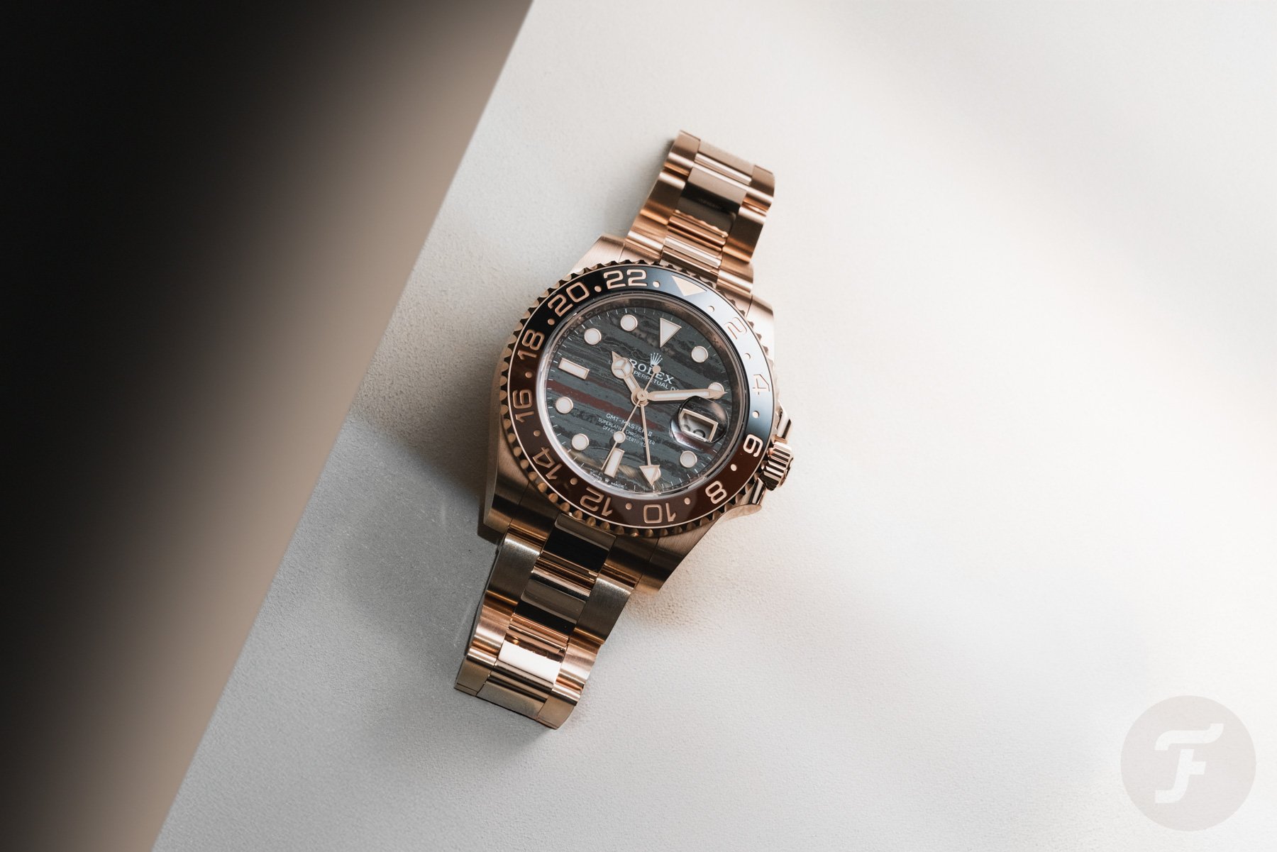When you think of stone-dial watches, you probably think of Rolex. There are way too many desirable Rolex models in this category. The solution is to only show The Crown’s latest creation. This year, Rolex presented an Everose GMT-Master II with an intriguing tiger iron dial showing many color details. The dial of this year’s Rolex GMT-Master II “Tiger Iron” ref. 126715CHNR (€51,250) is a metamorphic rock — a mixture of tiger eye, red jasper, and hematite stones — that gives the watch an almost wild appearance. It seems a muscular sports watch is needed to control the wild tiger iron dial.