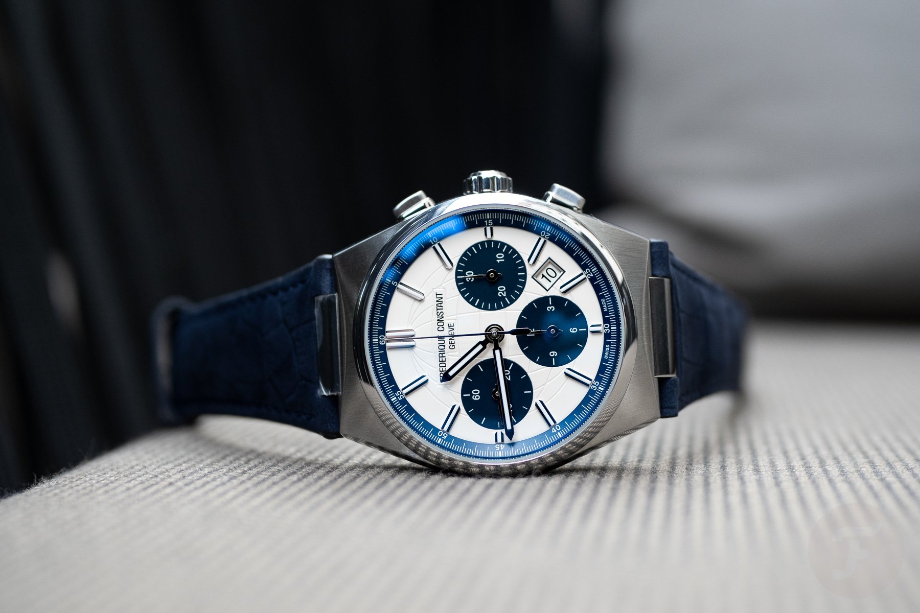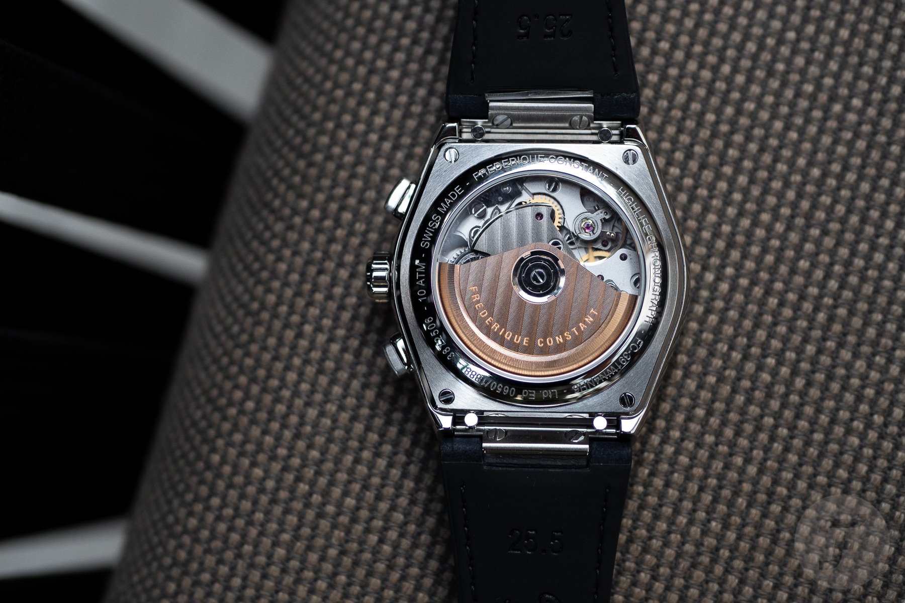 As you can see, at first glance, these watches have a lot in common. They both feature a tri-register chronograph with sub-dials at three, six, and nine o’clock, as well as a date at four-thirty. Both watches have an outer track matching the color of the sub-dials. They’re both integrated-bracelet designs (though the Frederique Constant is on a leather strap in these pictures, it is also available on a steel bracelet), and flipping the two watches over, you see the automatic chronograph movement through an exhibition case back. But what is it that truly sets these watches apart?