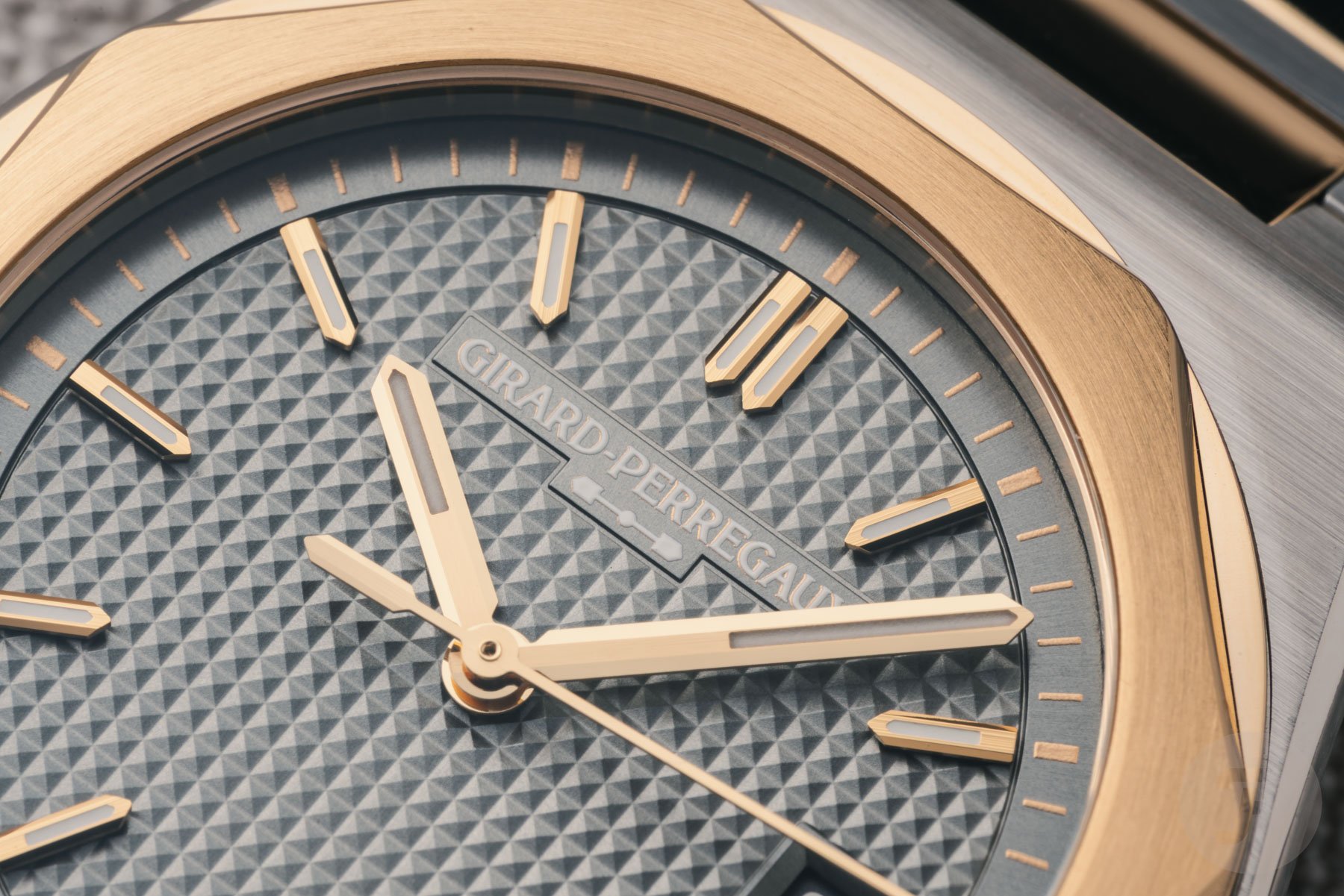 Additionally, the crown and center links of the integrated bracelet are yellow gold for extra visual impact. What truly makes the watch for me, though, is the dial. Girard-Perregaux cleverly chose gray for this one, and it features the characteristic Clous de Paris pattern. Add the yellow gold applied indexes and hands, and you get a dial that proudly oozes ’70s style.