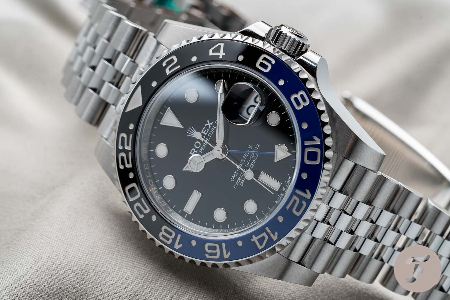 Black and blue was the perfect choice to showcase the bi-color ceramic bezel. A mandate was set by Rolex that the entire bezel insert had to be a single piece. For the process, blue is laid down first on the full circumference of the bezel. Black is then coated on the pm half, superseding any color beneath. Not so easy with the red and blue “Pepsi” version, whose colors are similar in lightness. To get the balance right, blue and red flakes are placed on either side and baked in different temperatures on each half. This leads to a little bit of red on the blue side and vice versa. For this reason the blue side has a more purple hue when compared to the aluminium bezels of previous generation “Pepsi” GMT-Masters.