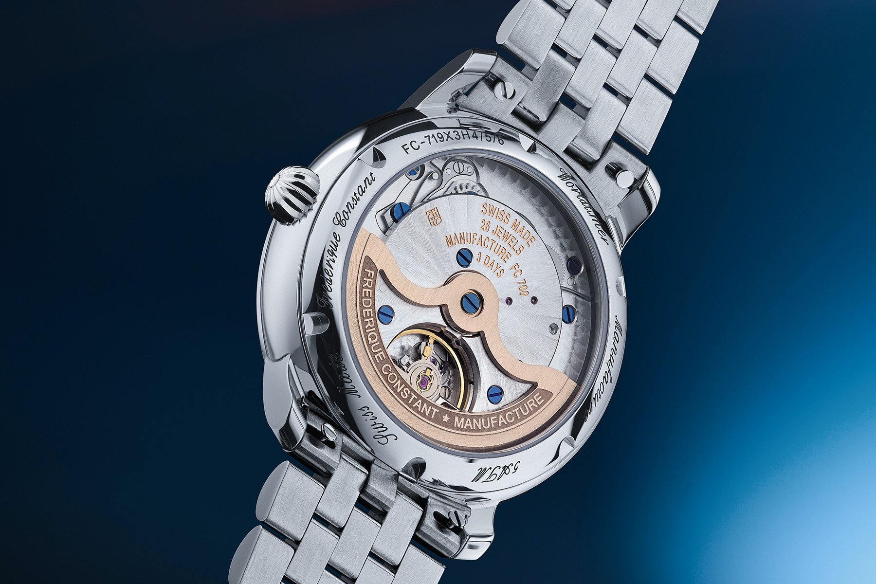 The automatic FC-719 is visible through a sapphire window in the case back, and it’s worth viewing. With its 72-hour power reserve, the brand’s 35th manufacture movement is an upgrade over the prior FC-718. Despite the increase in power reserve, it still runs at 28,800 vph. Plus, it has perlage, sunburst Côtes de Genève finishing, and a skeletonized rotor. Whereas the Nomos has a technical Teutonic look, this piece certainly trades on traditional Swiss finishing.