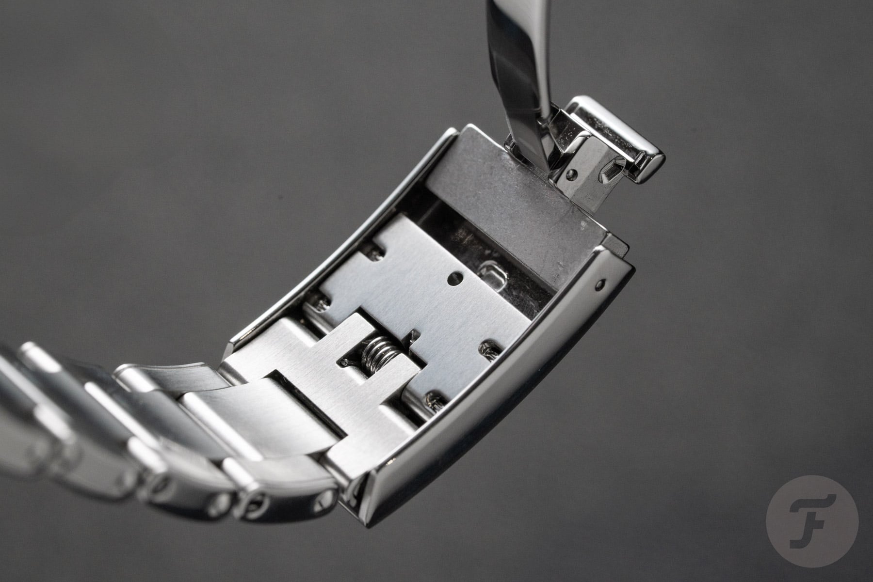 The latter is slightly controversial with its faux-riveted links, but it is beautifully finished. It also comes with a toolless micro-adjustment system in the clasp. Finally, from a functional perspective, the watch has a 200m depth rating, which is double that of the Nomos.