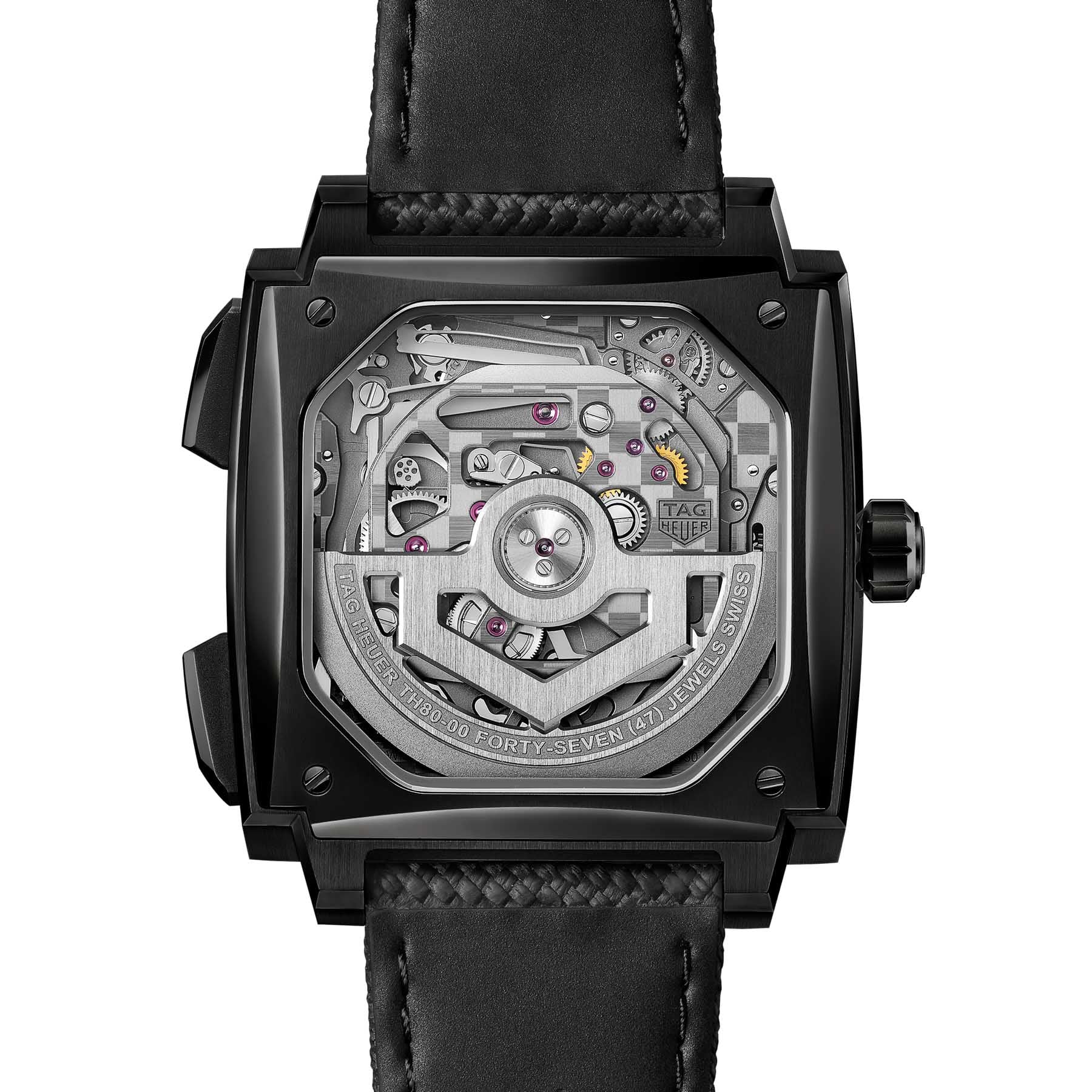 The Monaco Evergraph showcases the TH80-00 automatic chronograph movement. This caliber was developed in partnership with Vaucher Manufacture Fleurier and includes a TH-Carbonspring balance and escapement. The latter was designed directly by the TAG Heuer Lab. The significance of this is the elimination of all levers and gears traditionally used to stop, start, and reset the chronograph function. To produce this component, TAG Heuer uses a process called LIGA, which stands for “lithography, galvanoforming, and abforming.” It’s a highly accurate process used to create components for watches, medical devices, and other precision industries.