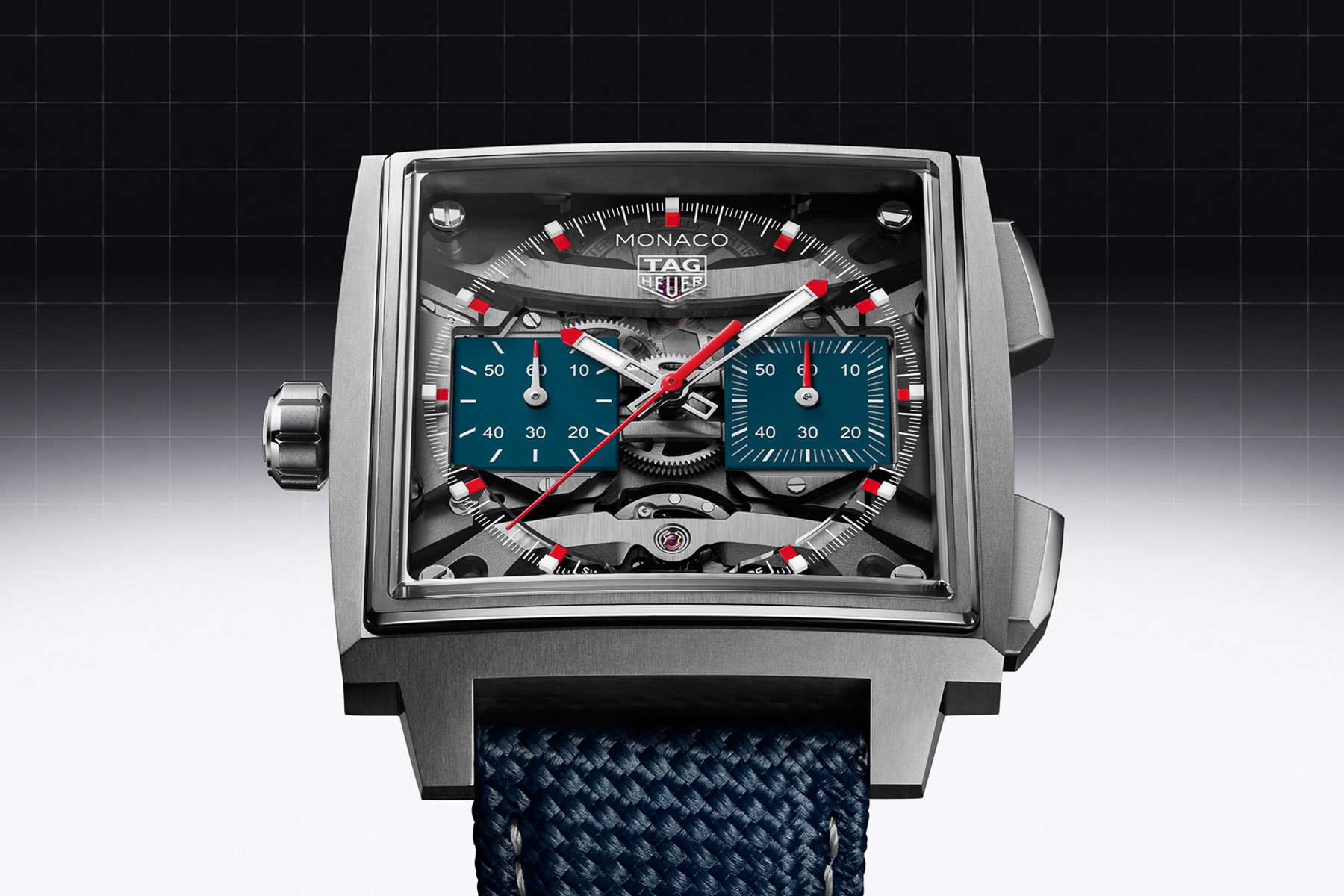 Inside, the new Monaco Chronographs use the brand’s in-house TH20-11. Here, it has been reengineered to provide the watch’s signature left-flank crown position and right-side pushers. The 31jewel automatic is visible through a sapphire display on the back and features Geneva stripes and a prominent column wheel. TAG Heuer’s caliber ticks at 28,800 vibrations per hour and delivers an 80-hour power reserve, an impressive feat.