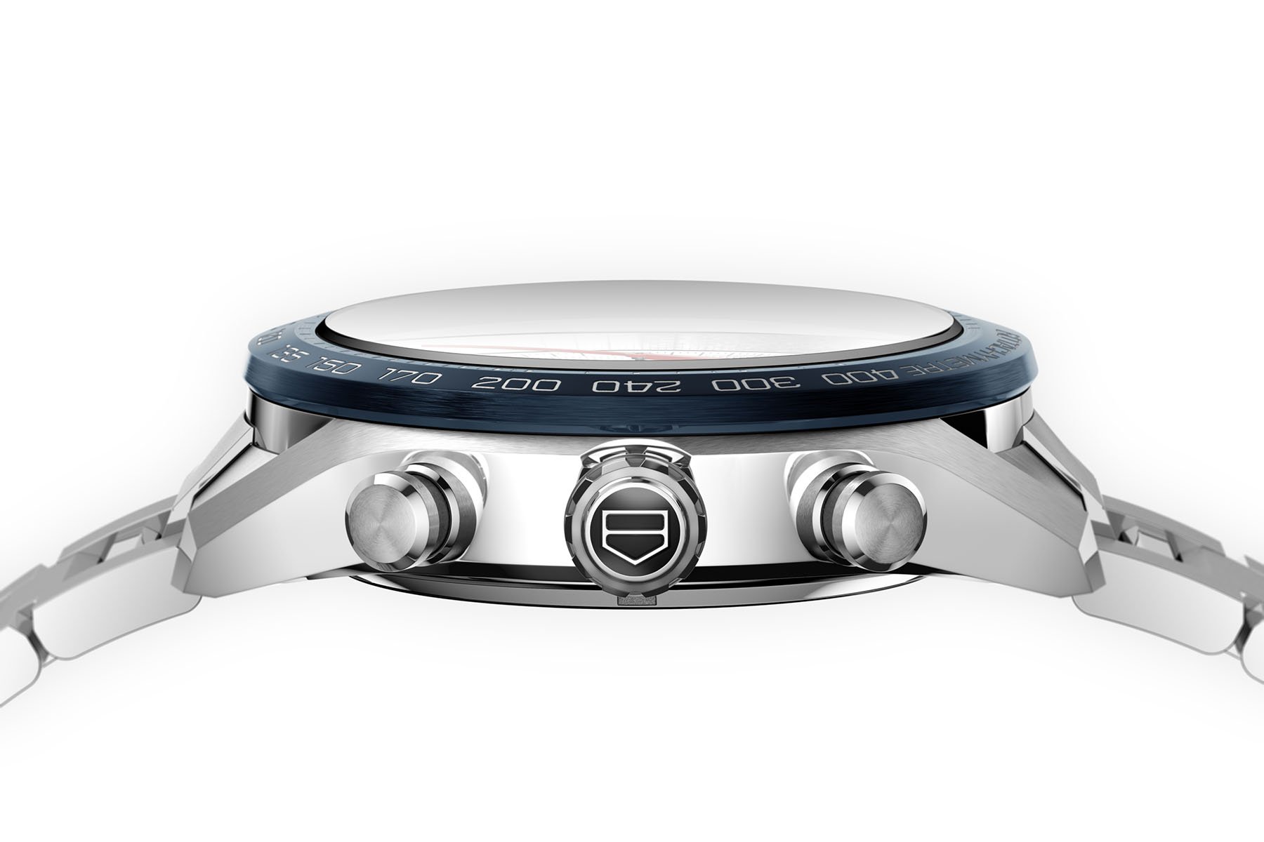 For the Carrera Sport Chronograph 160 Years Special Editions, TAG Heuer decided to re-introduce the placement of the date at 12 o’clock. And to make sure the date is visible, the brand also used a white date disc and contrasting red numbers. The most significant difference compared to the original Carrera “Dato 45” is the use of a red chronograph seconds hand.
