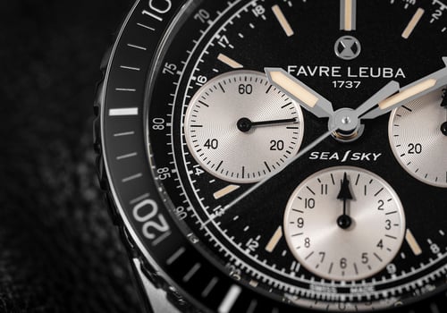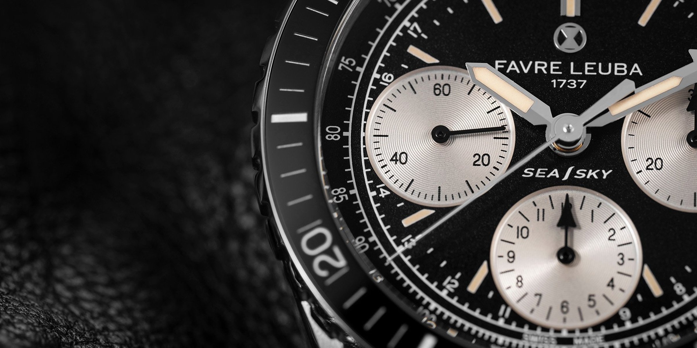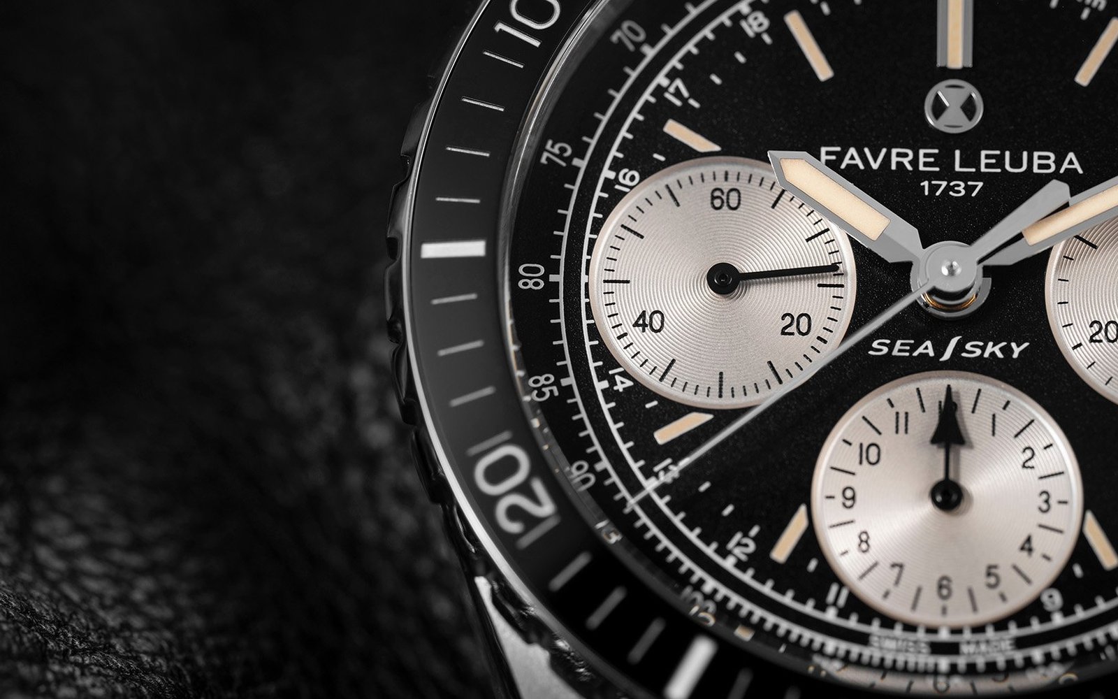 The Sea Sky is the second line that brings back a great vintage design. As Mike explained, the 1960s models combined aspects of diving and aviation watches. They had an impressive 100m water resistance rating, a rotating 60-minute bezel, and tachymeter and telemeter scales. For the modern version, the Favre Leuba team decided to stay close to the original classic.
