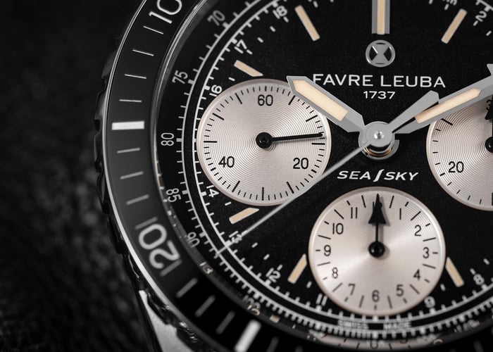 The legendary manual-winding Valjoux 72 caliber powered the original Sea Sky models. For the modern versions, Favre Leuba turned to La Joux-Perret for its L112, which is rebranded as the FLC01. This automatic chronograph movement is based on the popular Valjoux 7750.