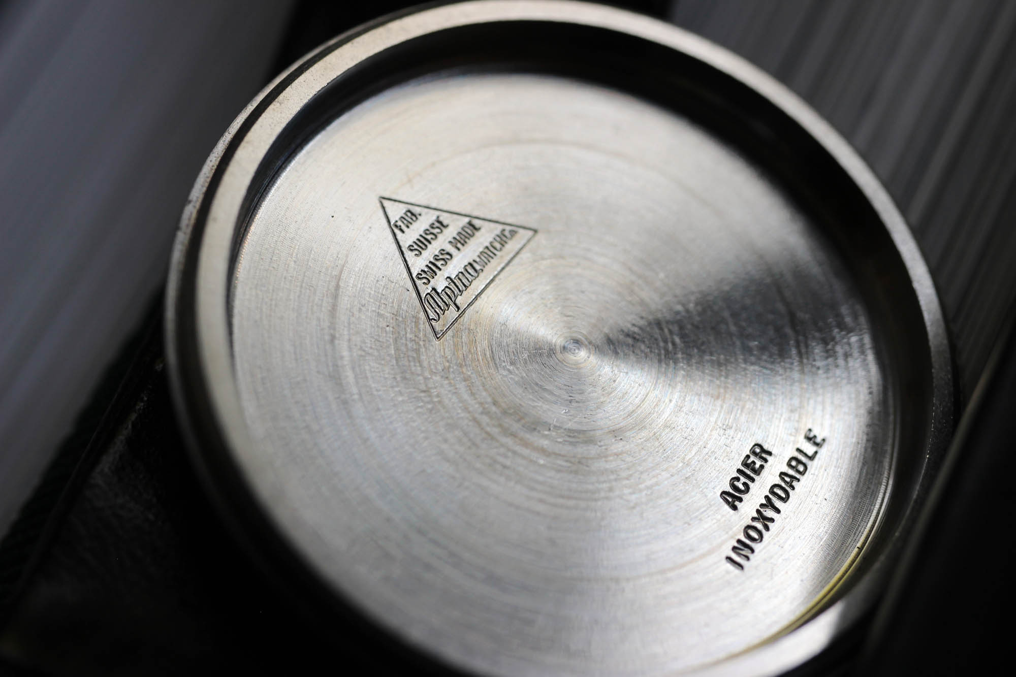 Whenever I am evaluating a proclaimed NOS watch, I think of this Alpina Standard Leihuhr. Just look at it. Be careful not to get cut on the razor sharp case edges. And I don‘t know how to put this, but I like staring at the case back. Yes, there is nothing there. No brand. No anti-steel-whatever-sign. Just a few tiny numbers and that’s it. Just a perfect, brand new brushed surface reminding me of a morning ski piste.