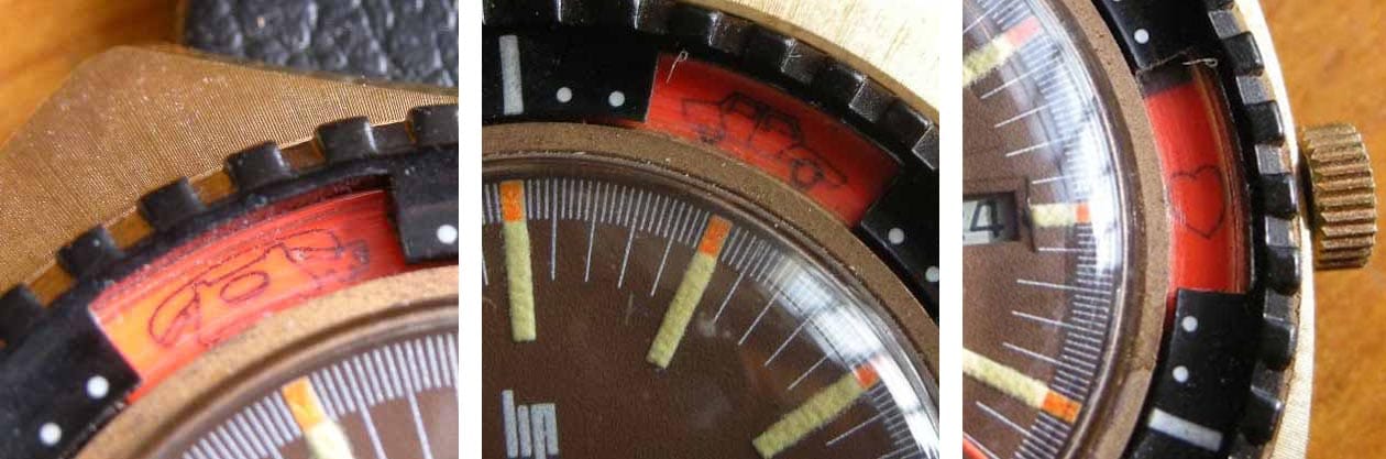 The bezel on the Lip Mémo is perforated and when you rotate it, you uncover one of six small icons: an envelope, a basket, a phone, a car, a heart and a package. Just to remind the owner of something he or she needs to remember. The brilliant idea some 40 years ago, when Post-Its or even a knot in a handkerchief was considered the most efficient reminders.