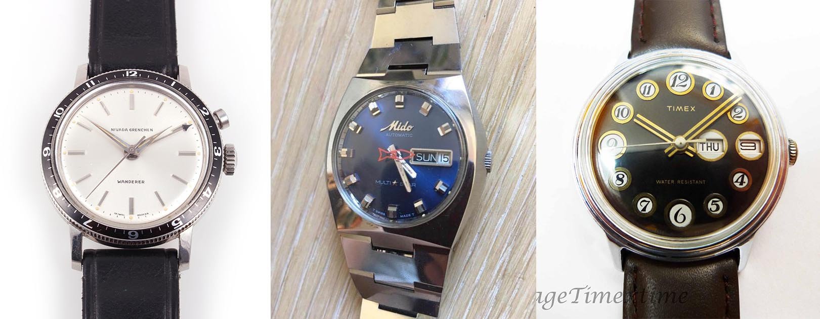 Nivada: www.dorotheum.com, Mido: www.catawiki.com, Timex: www.etsy.com
