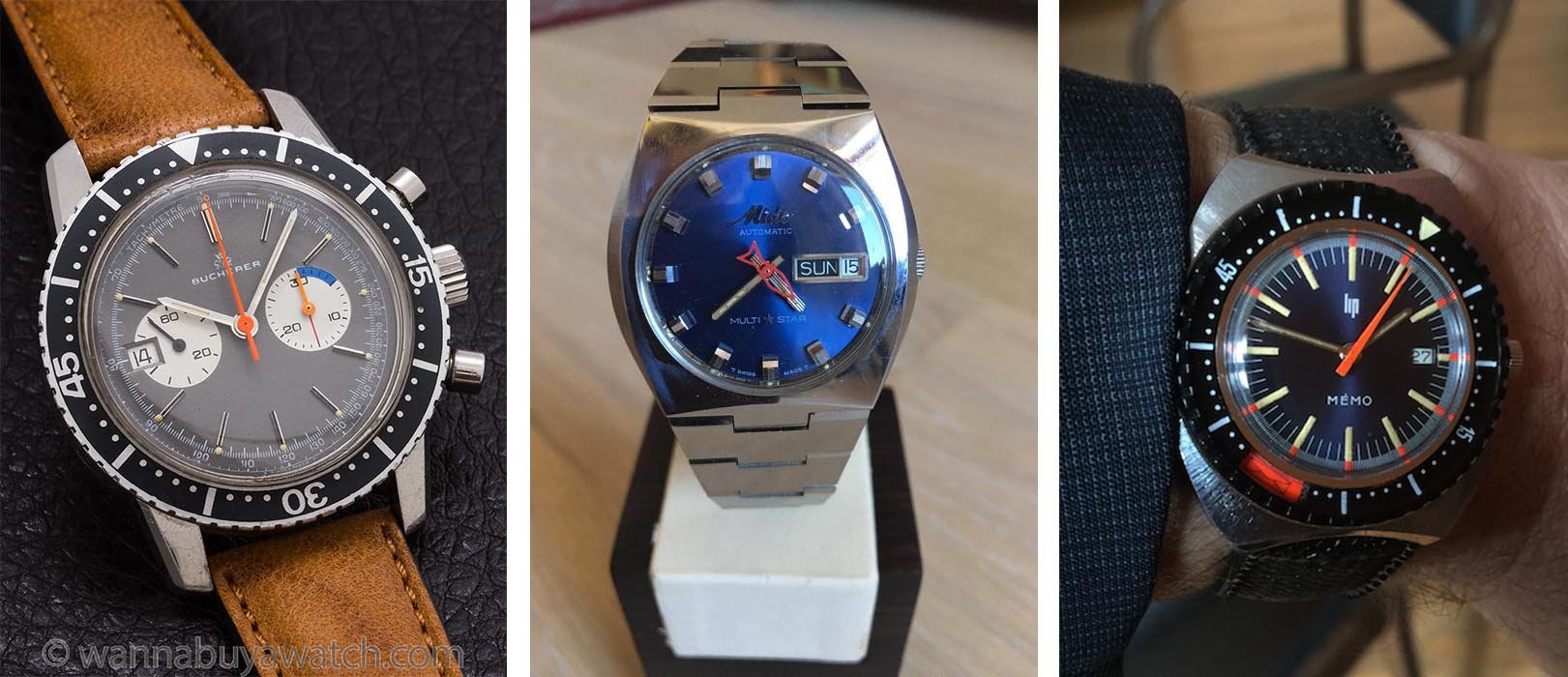 Let’s start with our selection for July: You will meet the Lip Mémo, a Nivada Wanderer alarm watch, a Timex Telephone Dial, a Mido Multi Star and last, but not least, “tough guy” Bucherer Date 9.