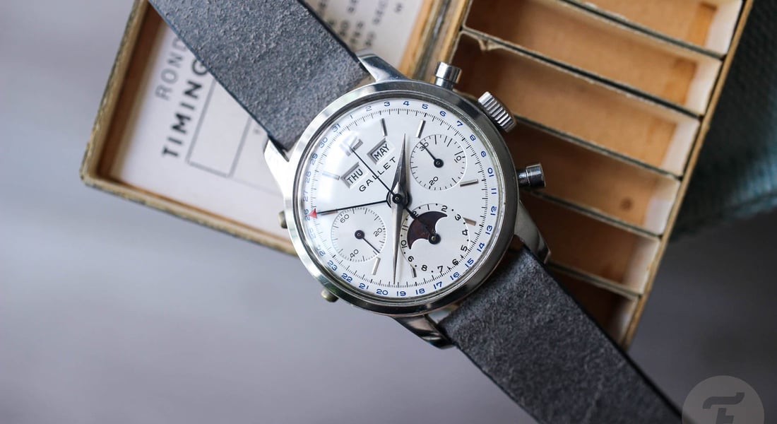 Last December, I reviewed the Valjoux 72C-powered Gallet Calendar Chronograph, which is listed in catalogs (and stamped on the case back) with reference number 998. I believe my excitement about that watch was evident. Today, six months later, I still cannot get enough of its whitey-white dial. It was one of the biggest surprises for me. It has grown on me so much that it has got way more wrist time than my Heuer Autavia or Breitling Avi 765 Lucy Digital, which are way more desirable and sought-after than Gallet chronographs. There is something special about the proportions, white space, branding, and color detailing that gets deep under my skin.