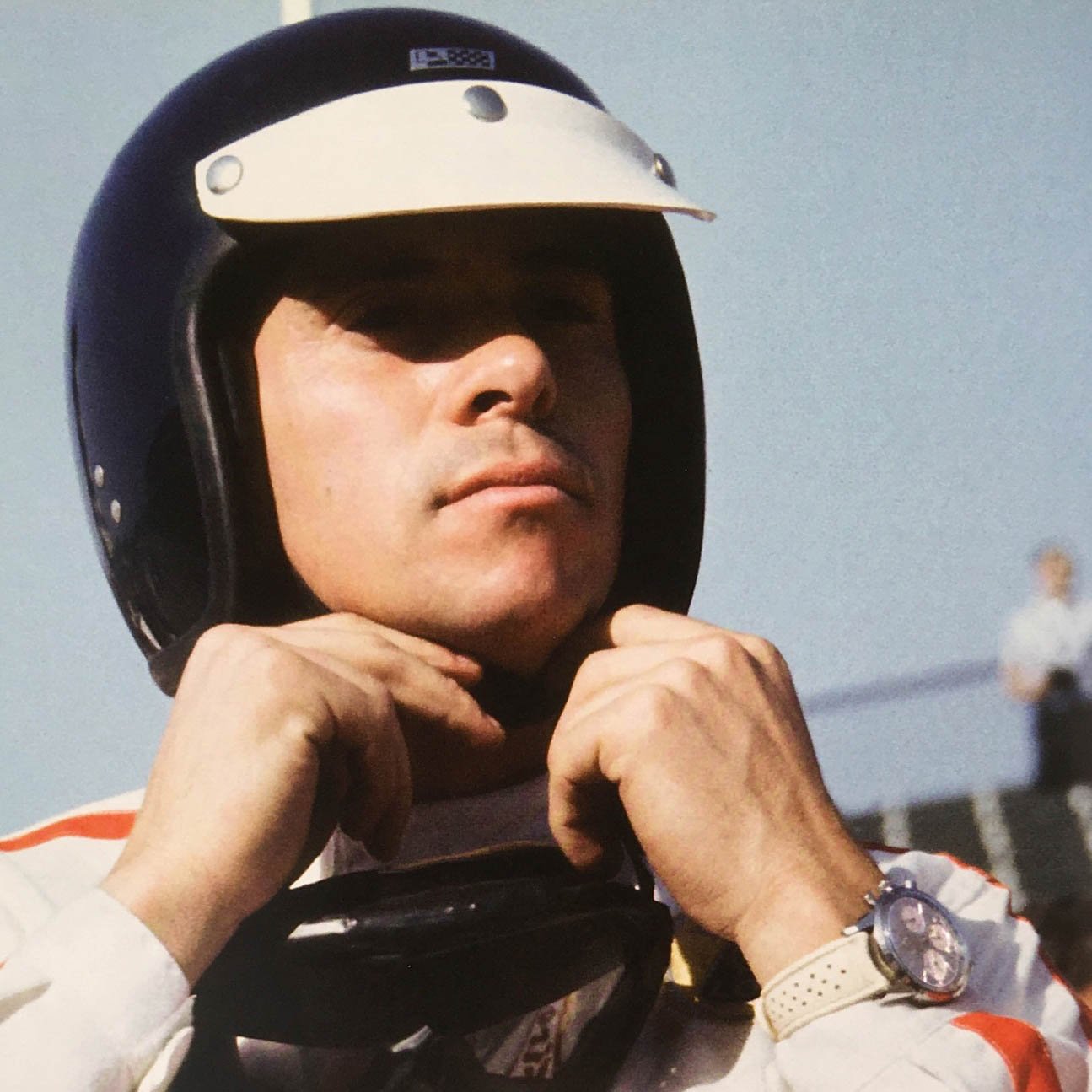 As more evidence, David Laurence sent me a picture in which, he says, “you can see the watch on Jim’s wrist as he is preparing for the qualifiers.” First of all, one can hardly consider such a photo as evidence. Besides, as hard as I try, I don’t see a black-dialed watch. What I see is a bright-dialed watch on Jim Clark’s wrist, and it is, in fact, an Enicar watch. And that brings us to another chapter.
