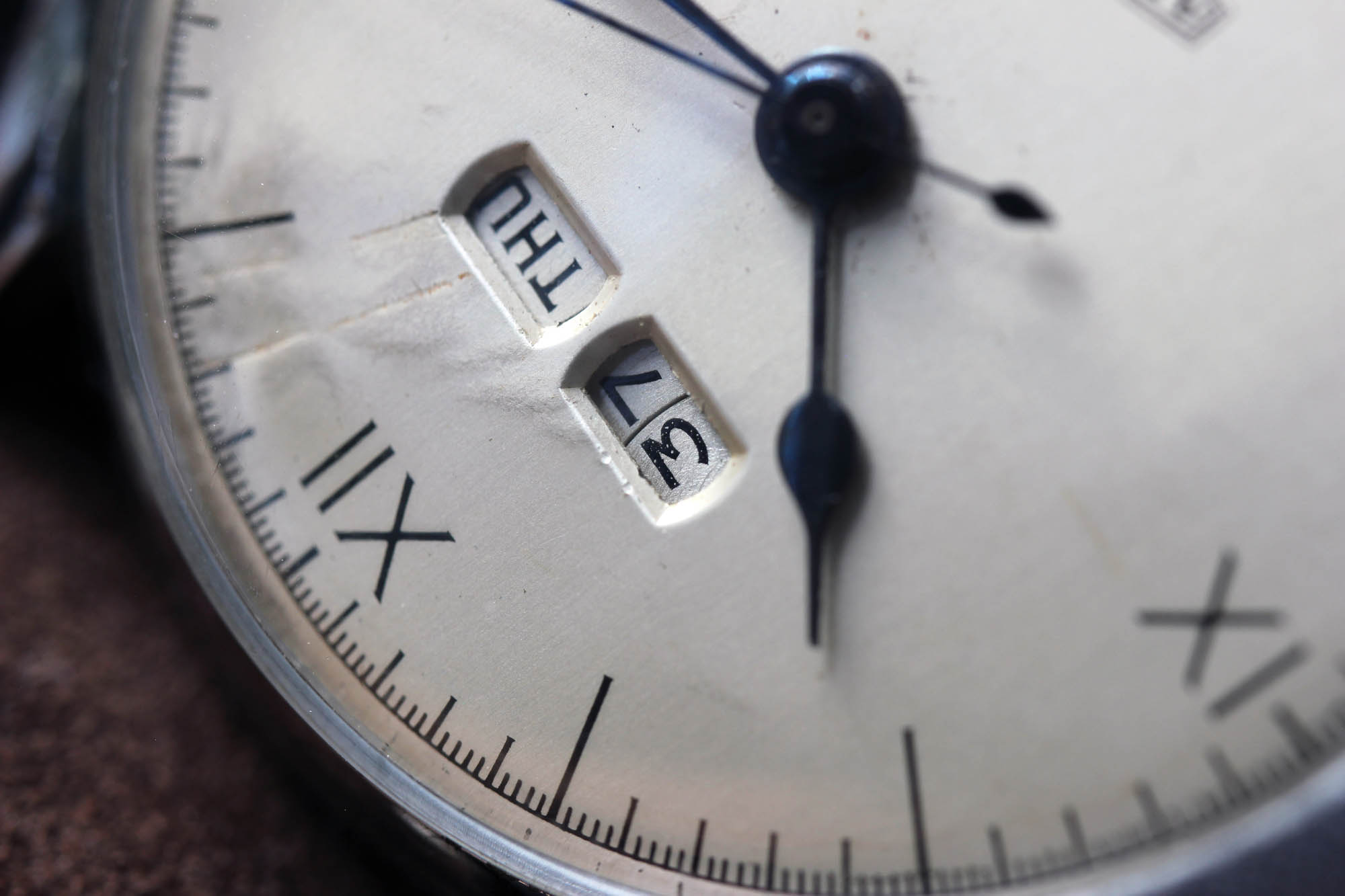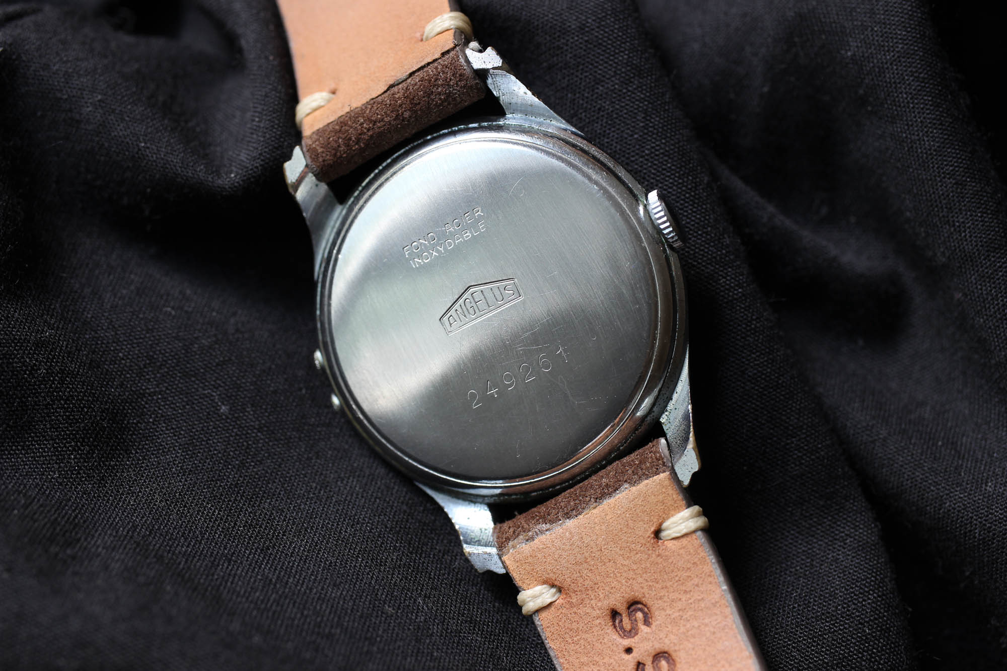 While it is not visible at certain angles, it is there. A problem. You can see two deep scratches between the 12 and 1. It seems to me that the watchmaker held the dial too firmly in his pliers. This would usually be a no go for many collectors and I too would not consider a with a dial in such condition under standard circumstances, but this Angelus Dato 12 with 35 mm in diameter cast a special spell on me. Whether the dial is damaged or not, seeing such a terrible scar makes us all super aware of the cruel reality. There are so many butchers between watchmakers that sometimes you just want to cry. So sipping on a glass of Weninger’s Welschriesling while writing these lines, I toast to all the amazing watchmakers that take care of our vintage pieces with patience, love, the highest care and sense of responsibility.