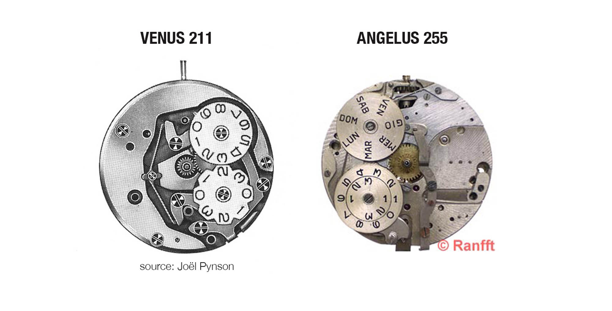 The date experience is very similar to the Big Date Bucherer chronograph with a 211 Venus caliber we reviewed. In the Bucherer there was only one aperture, and the date was produced by two discs rotating against each other. The date on the Angelus Dato 12 very similarly consists of two Arabic numerals, each one on a separate disc. But as you can see on a movement comparison drawing, the discs on the Angelus Dato 12 are concentric. It means that the final date is much smaller, but creates space for another disc that displays the day of the week.