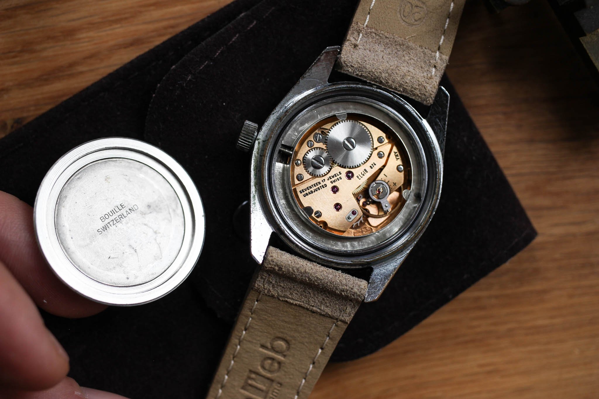 The case hides a movement signed Elgin 874, which is basically an AS 1525/1526. It’s nothing special, but it’s reliable and nicely colored when you get a chance to see it. The case back on my Elgin diver had a generous and unusual Elgin stamping, but some overzealous “specialist” ground it off. The brutal treatment and deep scars from the rasp can be seen around the raised edges where an opener would grip. The purist in me suggests it was handled by a masochist. At the same time, I am having fun imagining someone with a big file hovering over it and “fixing” the case back. We all should keep in mind that a collectible watch today used to be just a proper tool a few decades ago.