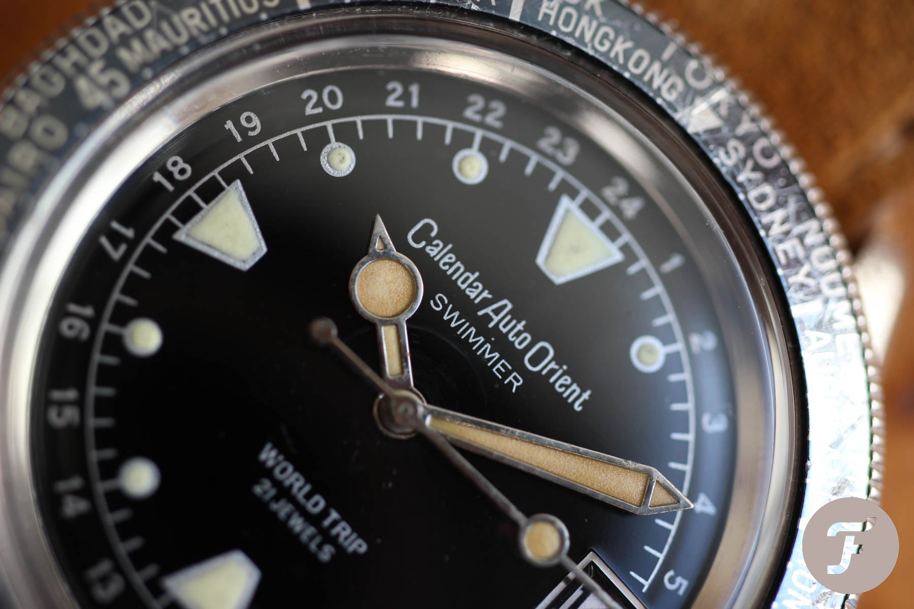 Calendar Auto Orient Swimmer Worldtrip. Way too many words? I agree. With the 4ATM water resistance, the Swimmer part might slightly arguable. Especially when pondering over the beautiful diver engraving on the case back. The Calendar and Auto are quite obvious. The world-timer is what makes it pretty interesting. Especially if you combine a world-timer bezel with 24h markings decently projected directly on the dial.