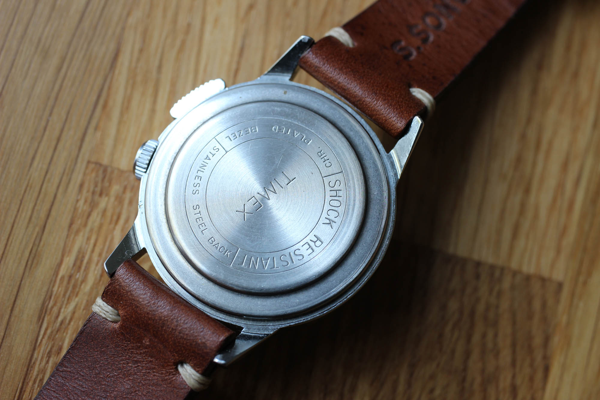 Where the Southampton name comes from is a bit of unknown, we can only guess. Winding this watch is honestly a pain in the ass, at least mine. Same might apply to watch service. Quoting my watchmaker to whom I send all the pictures of watches I happen to find: “I hope I’ll never find this watch on my bench.” The case back is nicely signed. As visible also on the brochure, original Timex Southampton came on a brown padded leather strap. There was also a black dial version of Southampton. Some identical watches in bi-colour option I prefer black – let’s take Angelus Chronodato as an example. Here I think the white dial version is a lucky charmer.