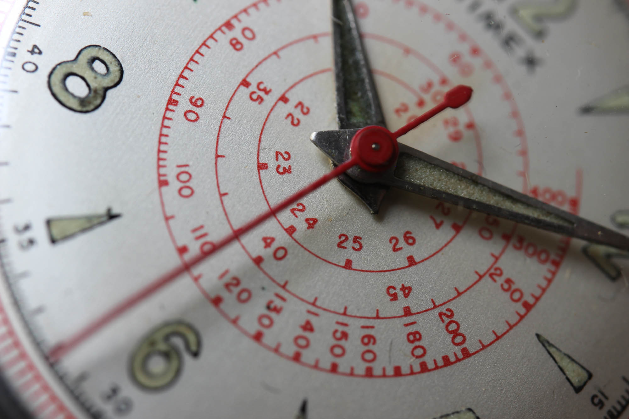 Connecting the dots on the three and only elements in red, you get what might be called a unique selling proposition of this watch. The trio of usual suspects consists of the central second hand, an outer telemeter scale and the central spiral tachymeter scale or so-called “snail.” Nothing unusual up to this moment, yet still quite valuable when present on a vintage watch dial, especially the snail. Skating on very thin ice starts if you move your attention over to the edges of the case. There is so few, yet contradicting information about the watch’s function and name.