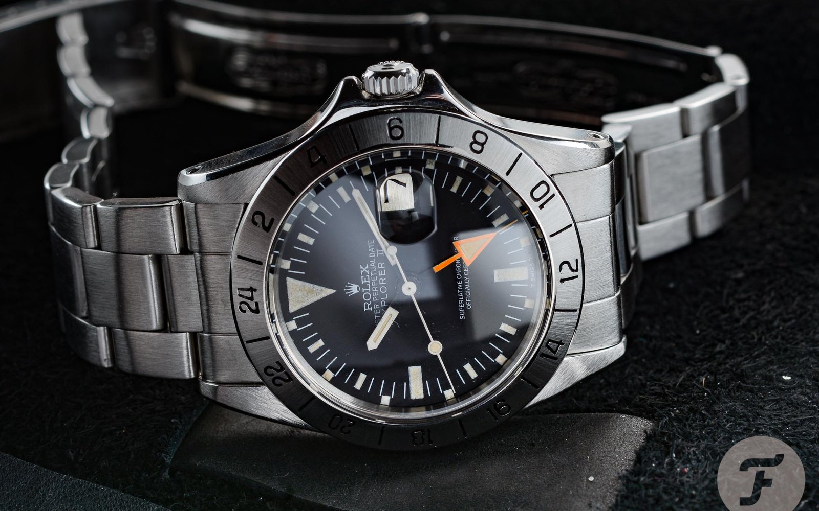 The Rolex Explorer II ref. 1655 is my favorite vintage Rolex. Is it practical? Absolutely not. But it looks so cool. It all starts with this quirky story about developing a watch aimed at speleologists or cave explorers. From the get-go, that story was never going to be a commercial success, of course. But as I explained in the article about the best Rolex watches from the 1970s, it did add the extra functionality of an additional central 24-hour hand and a 24-hour scale bezel. But the biggest attraction of the Explorer II ref. 1655 is, without a doubt, its funky appearance. The dial design is weird and rather impractical. The combination of a 12-hour scale and a 24-hour scale causes problems with legibility. But the effect of combining scales makes it look great. On top of that, the big orange 24-hour hand hard to be missed. And for once, the cyclops feels exactly in the right place in the right style instead of being an oversized nuisance.