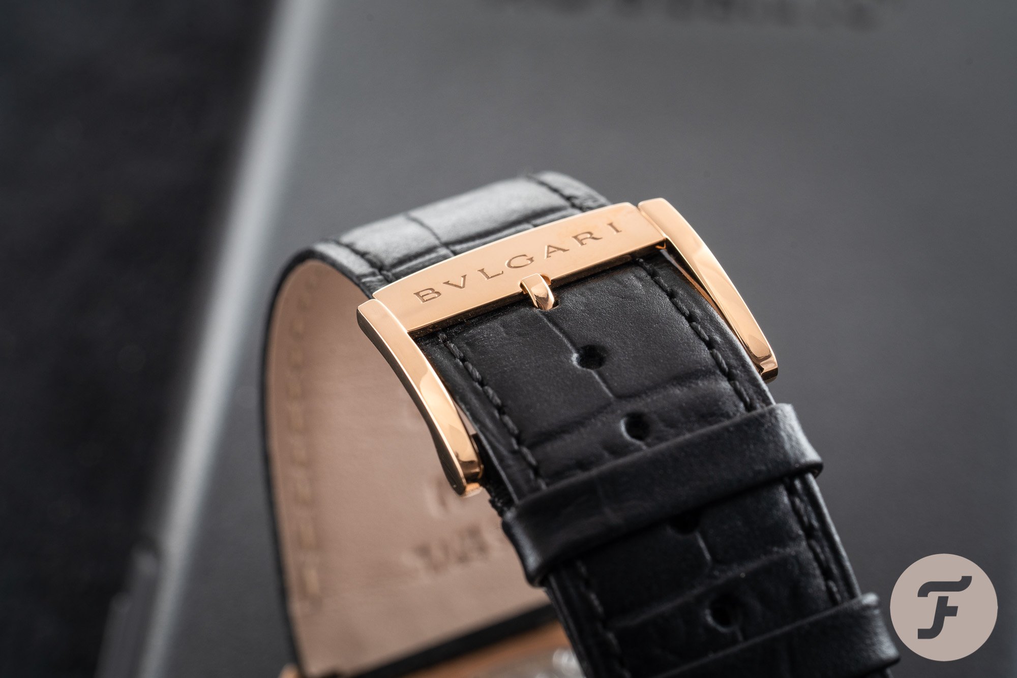 This Bvlgari Octo Finissimo watch in gold comes on a black alligator strap with a gold pin buckle. I don’t mind a folding clasp, but they tend to get a bit thick. When your watch is just over 6mm thick — or thin — it looks a bit awkward. So I fancy the pin buckle on this watch, which also comes in rose gold. The strap is relatively flat and very comfortable on the wrist. Of course, it is signed “Bvlgari”.