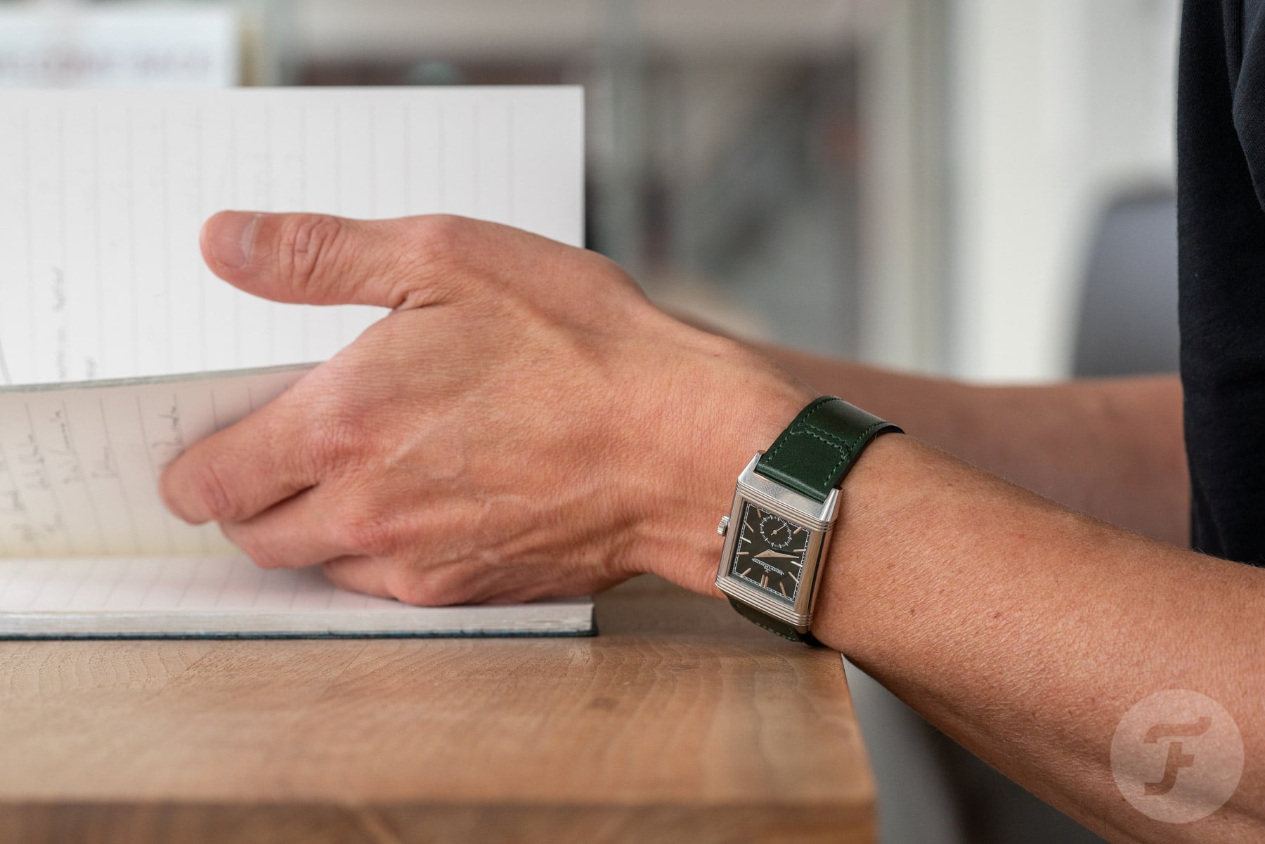 Back to the full green reality on the wrist. If you try to exactly match the green of the Reverso with let’s say a polo shirt, you’ll be in trouble. Maybe not if you’re running a Lacoste shop, but otherwise you most probably will struggle to find the right shade to match. The solution is to give up entirely. The different shades that the dial on this Reverso achieves don’t stand still or settle for a single tone, so why should you?