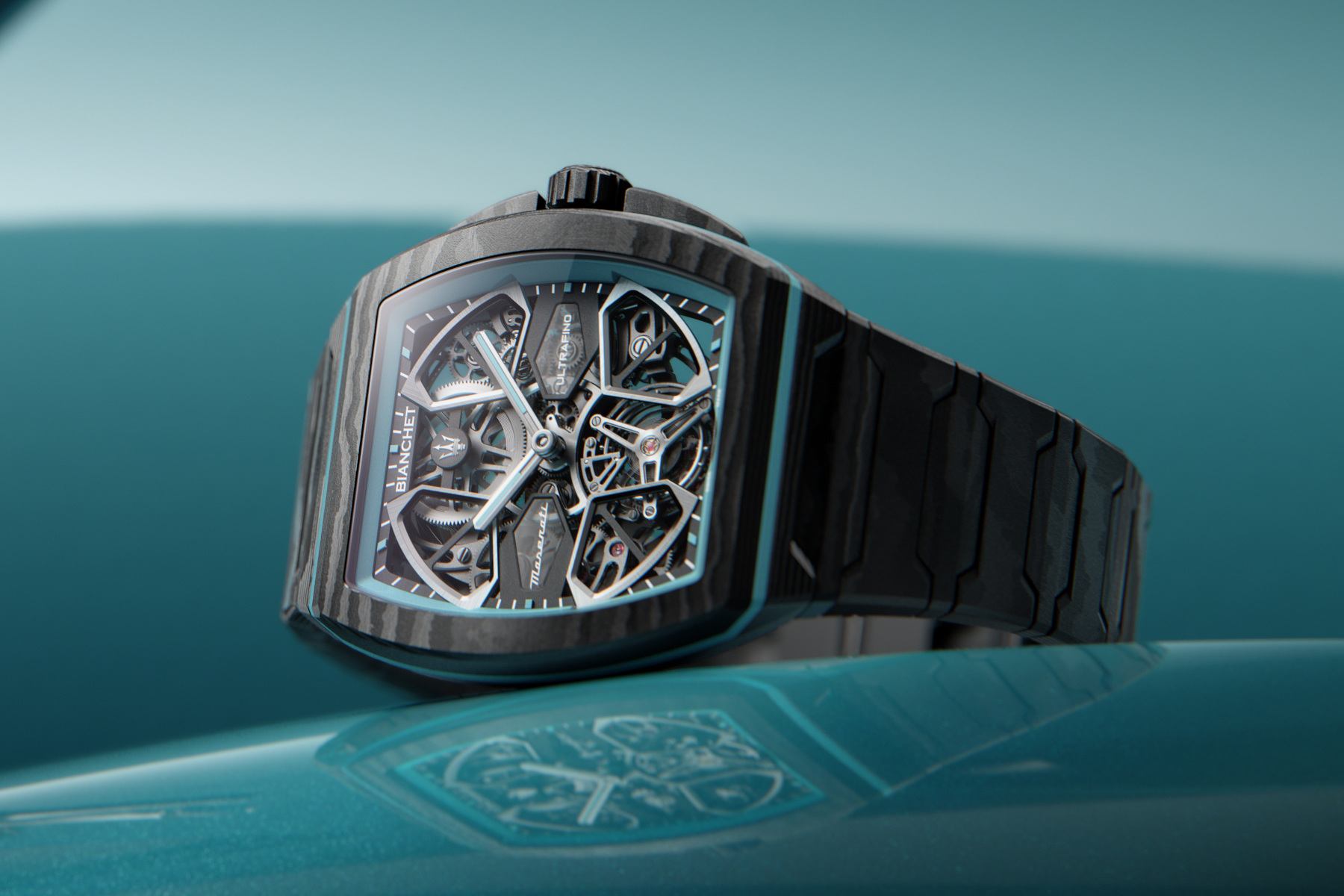 The strap/bracelet options also do a lot for the watch. On the integrated carbon bracelet, the UltraFino Maserati looks darker, sleeker, and probably a bit more serious. That version feels the most futuristic to me, and maybe the most “Bianchet” in the purest sense.