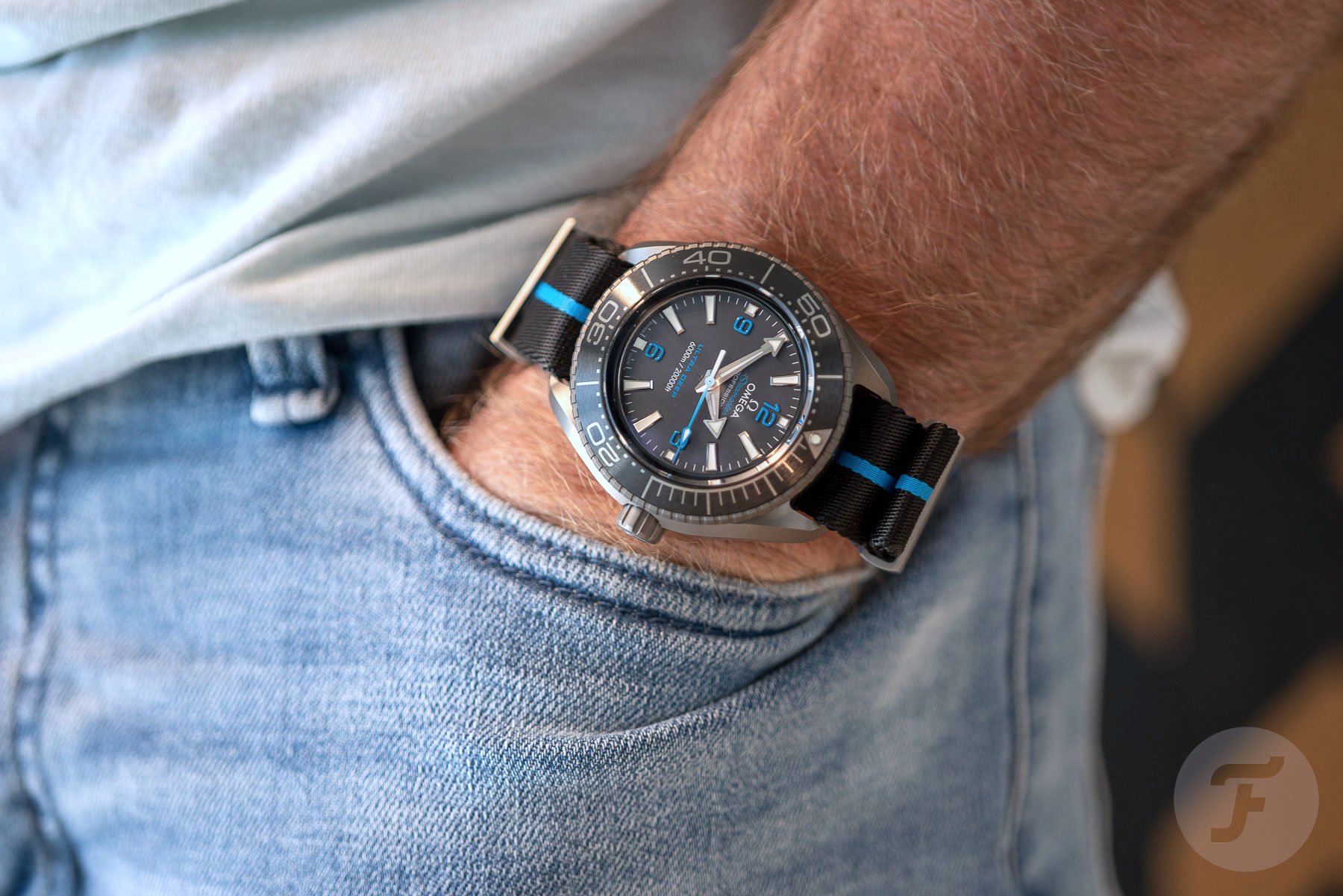 We wrote about this watch a few times before and got a lot of comments on it. In full, it is called the Omega Seamaster Planet Ocean 6000M Co-Axial Master Chronometer 45.5mm Ultra Deep — a model indication as exorbitant as the watch itself. Omega presents the Ultra Deep in two material variations — O-Megasteel and titanium. And there’s not only a variation in the material but also a difference in construction. The steel version uses regular lugs, enabling either a stainless steel bracelet or a rubber strap to be fitted. The titanium model, however, has fixed lugs, leaving it with a NATO-type strap as the only option. As I mentioned, we got many comments, specifically about the titanium version with its manta-ray fixed lugs.