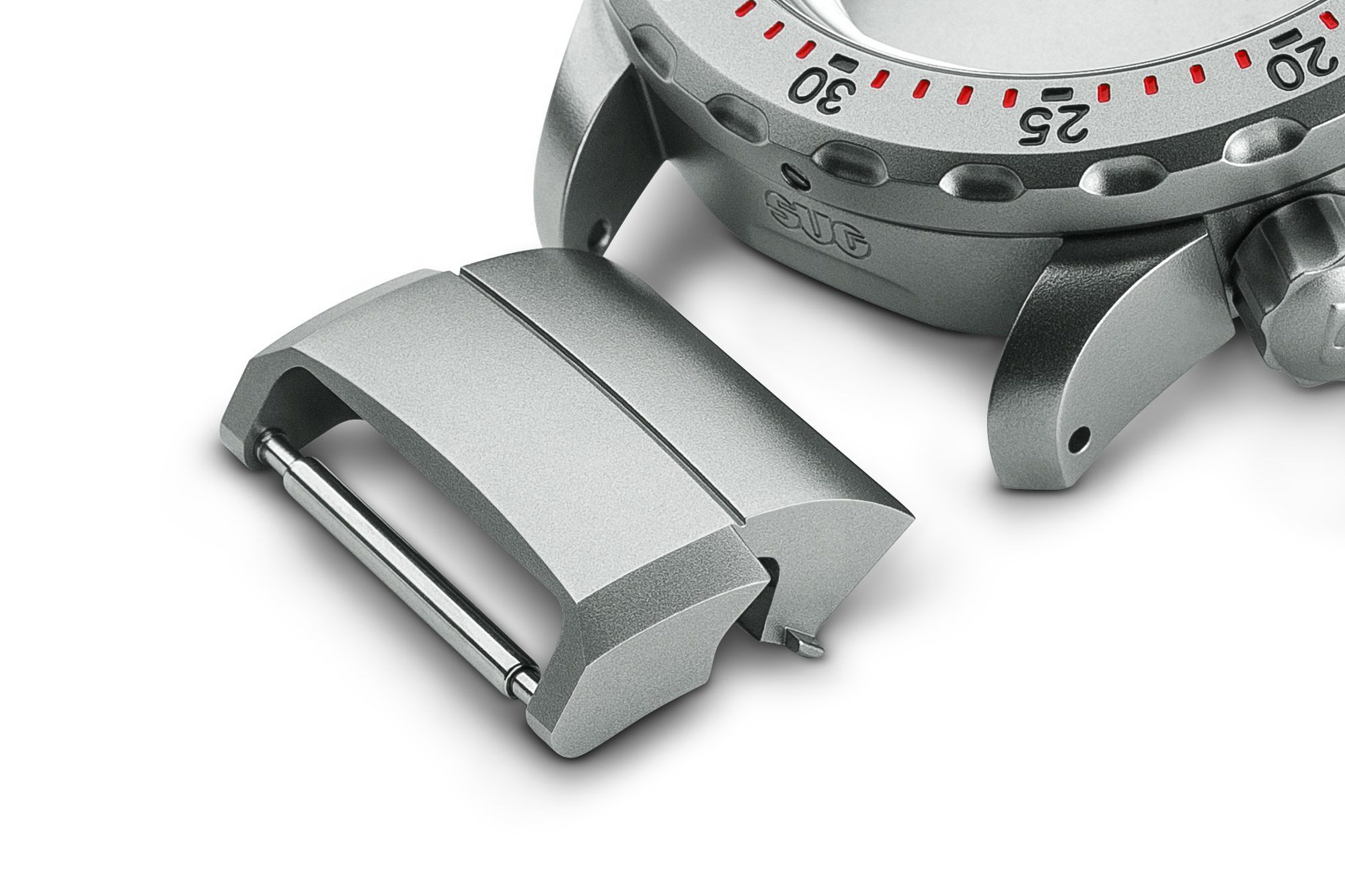 The case adapters remind me of a spring bar-less system that we first saw on the EZM 12 (a watch made for EMT’s, paramedics, etc – people who might want to remove their straps easily and without tools to clean the watch completely). In this version, Sinn suggests this quick change strap system for divers who need to move between short and long straps to accommodate a dry suit. So, if I read things correctly, you’ll essentially need two sets of silicone straps: one for daily wearing and one for diving.