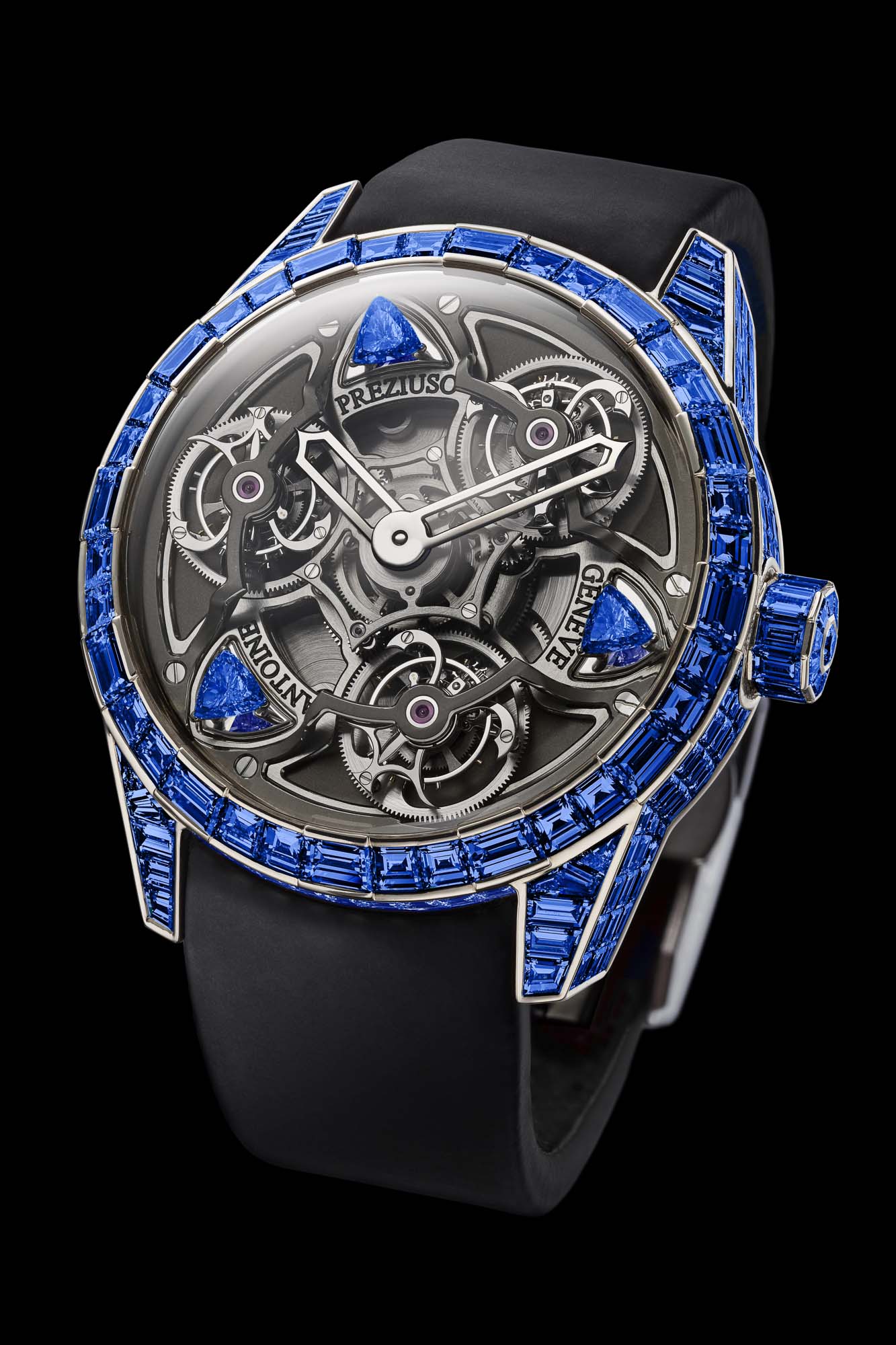 Blue has always been my favorite color and I’m known to wear a cabochon star sapphire ring now and again. But, if I really wanted to step up my game, perhaps I’d need the new Antoine Preziuso TTR3 Blue Equalizer Frequencies because it’s adorned with 233 blue baguette sapphires summing to an impressive 24 carats! But the stones are just part of the story here – we have not one, not two, but three tourbillons at work within this watch all sitting on a plate and using a differential in order to come together as one. The tourbillons rotate once per minute while the plate rotates once every ten minutes. The differential acts as the synchronizer and contains the world’s smallest ball-bearing at 1.6mm in diameter (I had to mention that – it’s cool). The price? Who knows as this is a unique piece, but if you have to ask… Visit Antoine Preziuso’s website for more information on the brand and their movements.