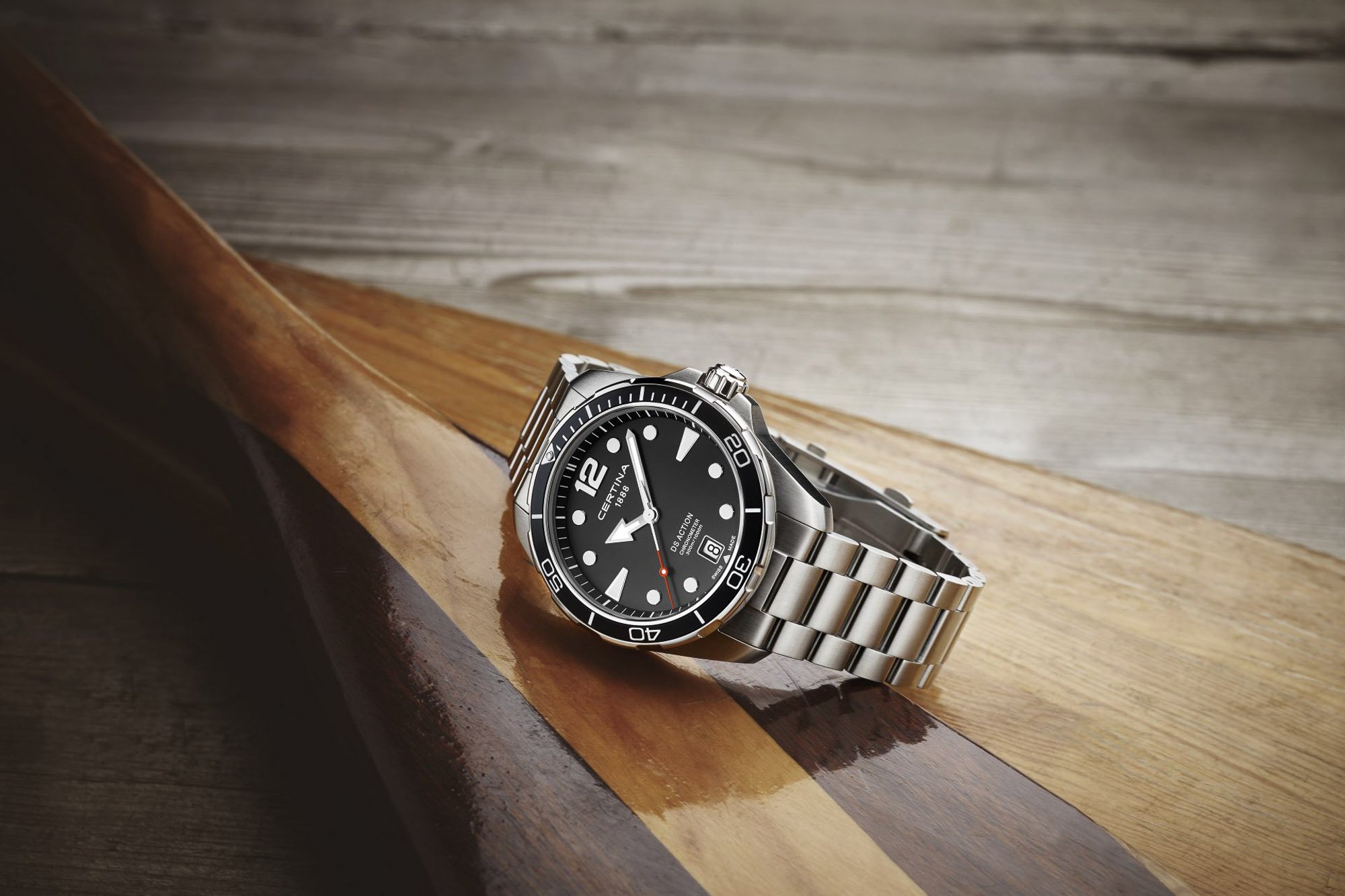 The next watch on This Week in Watches is the Certina DS Action, a quartz diver that debuted in the last month or so, but hit our mailboxes this week. This is a 300 meter diver with a chronometer-certified ETA Precidrive quartz. These 43mm watches are available in steel on bracelet with blue, black or green dials at 590 Euros. A titanium option exists on bracelet with grey dial for 735 Euros. For more information, head to Certina’s official site.