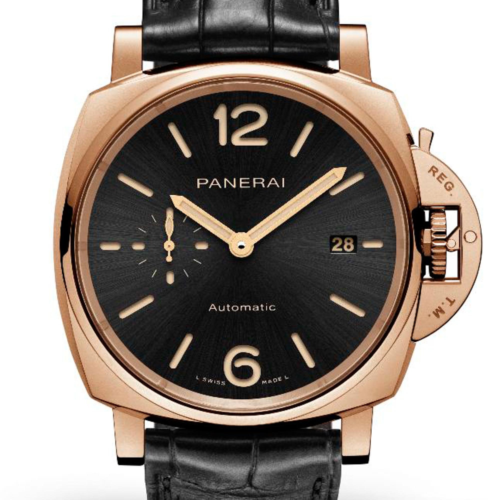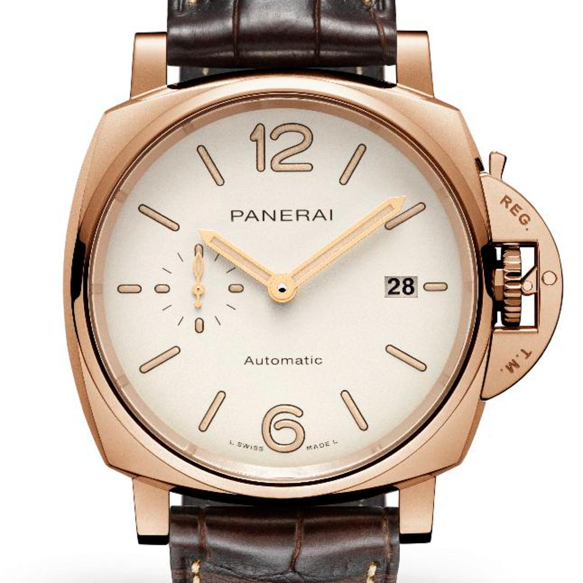 Panerai sent us news of two new 42mm versions of its Luminor Due. These are done in Goldtech, the brand’s alloy with a warm copper tone, but also with platinum. PAM010141 has a black sandwich dial while PAM01042 has a white dial with applied lume.